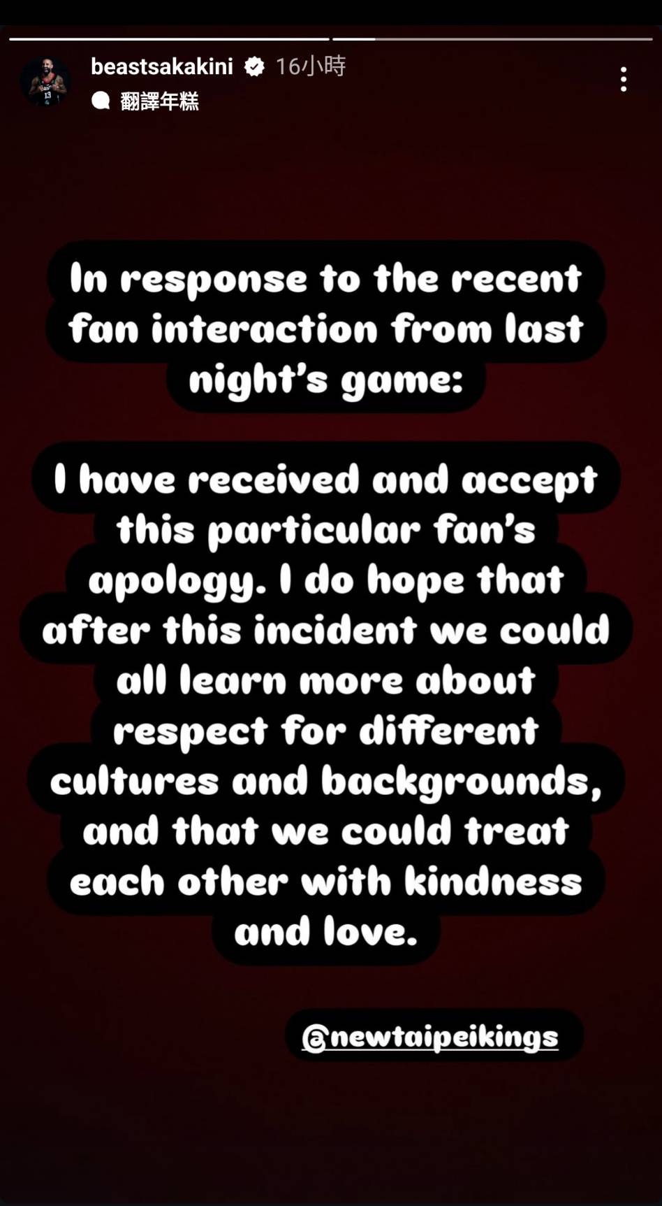 然而該事件昨天出現轉機,桑尼在社群上表示,「我已經接受這位特別的球迷道歉,我真切希望經過這次事件,我們可以學會尊重不同文化和背景,然後以善良與愛對待彼此。」