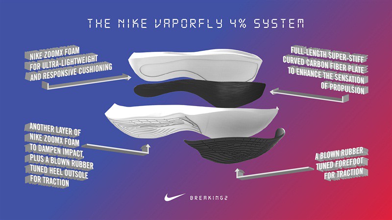 2016年1月,里約奧運馬拉松預選賽前,Shalane Flanagan和Amy Cragg拿到了 Nike Zoom Vaporfly 4% 的原型鞋,成為首批拿到這款跑鞋的女性運動員。2013年6月,Nike開始研發 Vaporfly 4% 動力系統,並在鞋底模具的研發上投入了大量精力。鞋底採用了全新的 Nike ZoomX 泡棉,輕質柔軟,並能夠提供高達85%的能量回傳。泡棉內嵌入了全長弧形碳板,提升跑鞋硬度的同時提供足夠的推進力。與 Nike Zoom Streak 6 相比,Nike Zoom Vaporfly 4% 能平均提升4%的跑步效率,如此高的跑步效率提升即使是在馬拉松比賽中也能明顯提升運動員的跑步表現和跑步感受。
