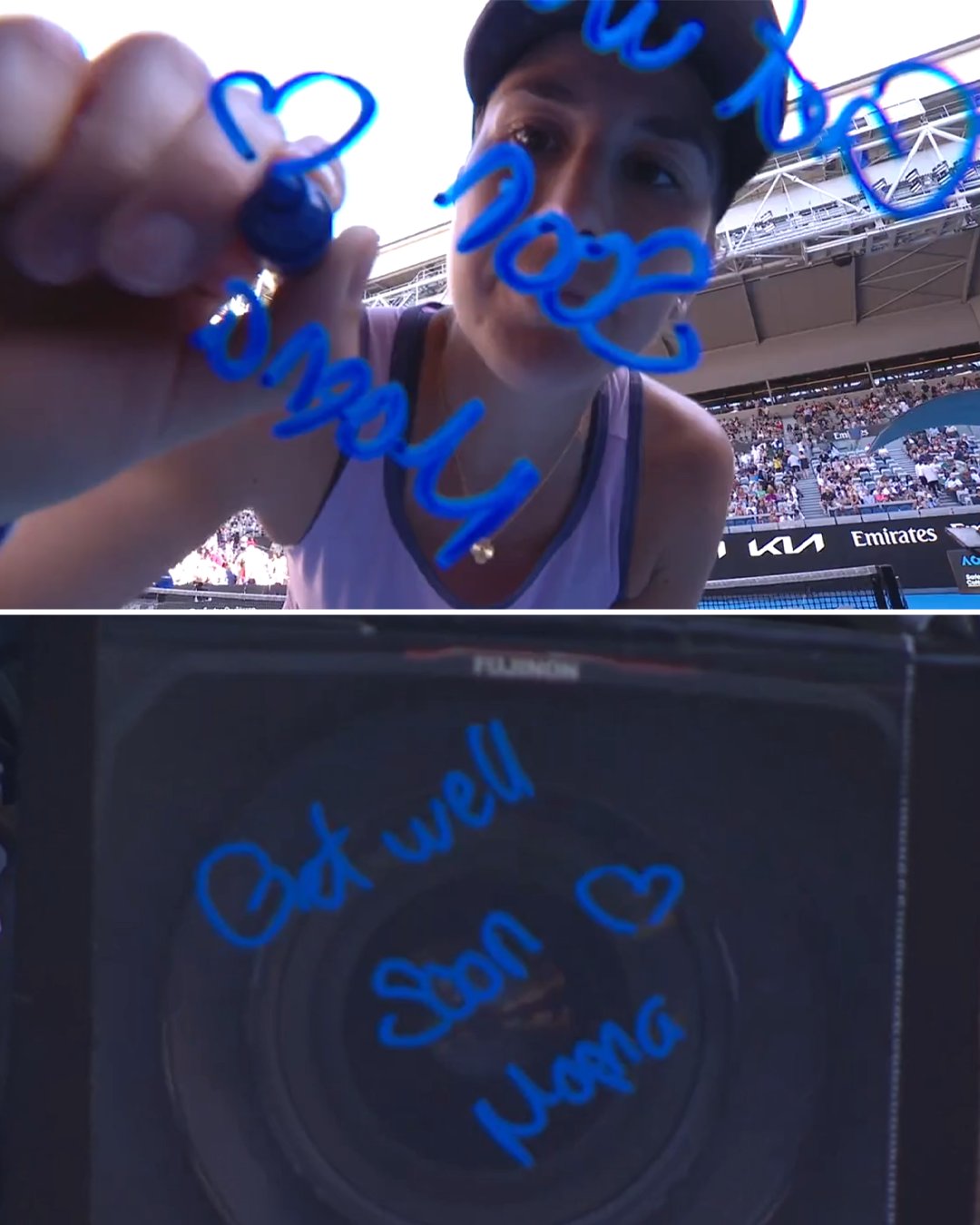 Belinda Bencic在鏡頭簽名時改寫下祝同為人母的大坂直美早日康復。(取自澳網官方X)