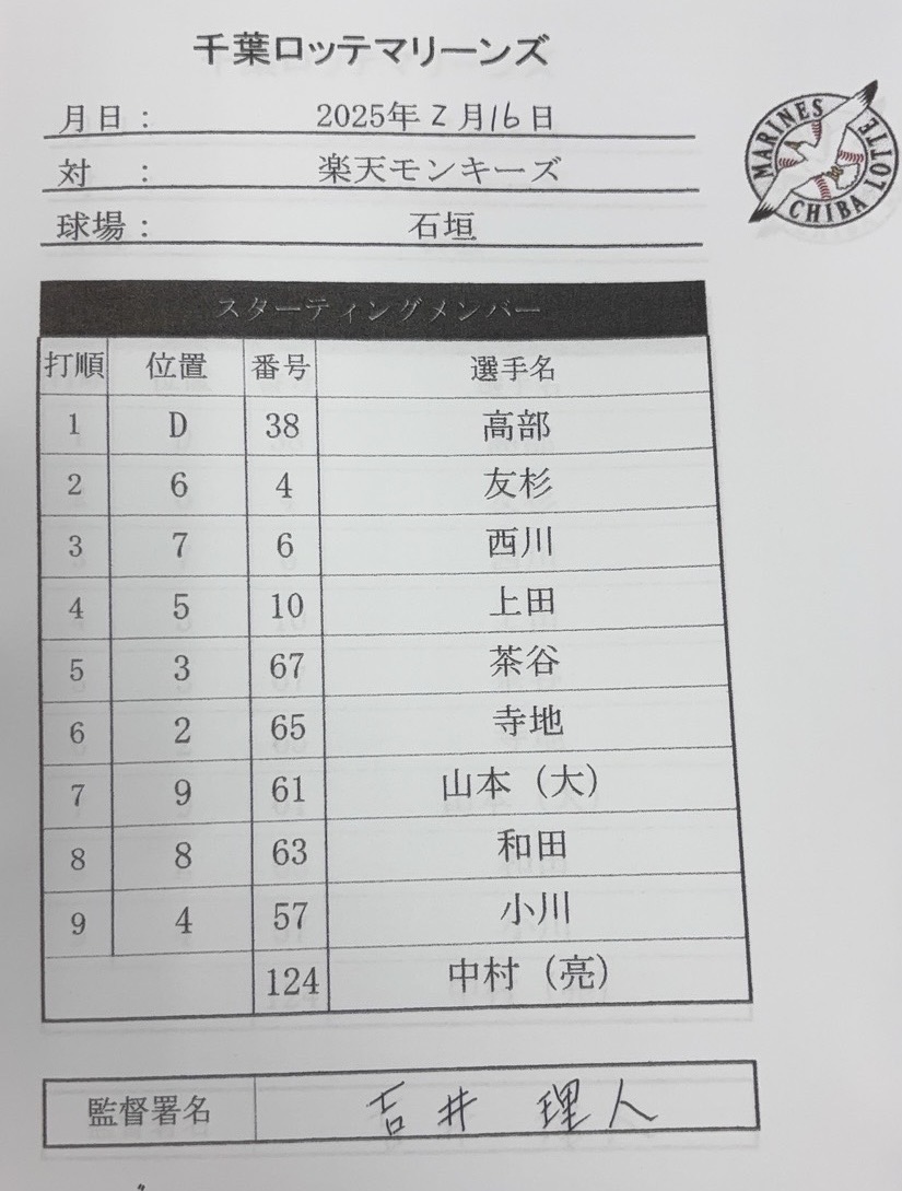 羅德打線預計以一軍為主,先發投手為育成選手26歲中村亮太,他是2020年日職選秀軟銀鷹第8指名選進,曾在2022年、2024年於一軍出賽,共3場登板,去年在軟銀鷹後援1場投1局就被轟2支全壘打。
