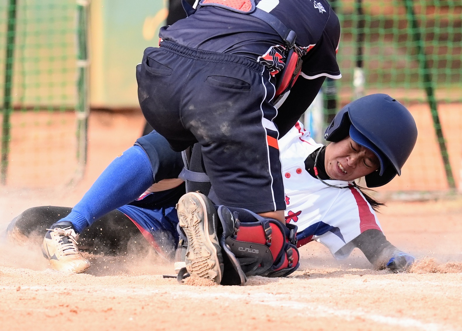 儘管第一階段預賽是因為衝本壘才拉傷右大腿,蔡寶貝今天仍勇敢滑壘毫無陰影。(大專院校體育總會提供)