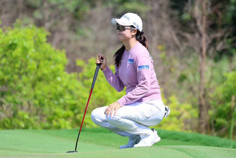今天前15洞淨抓6鳥、後3洞卻連吞柏忌導致只有-3,但累計-6並列第2的20歲韓國新星李東恩(이동은,音譯)說:「旗位確實挺難的,所以我都是無條件打安全牌,讓球到果嶺後能以打上坡推桿為主,無論如何不能打到旗竿後面,明天應該會採取差不多策略。今天最後是推桿出了點狀況,2洞2推、1洞3推,比較可惜。」
