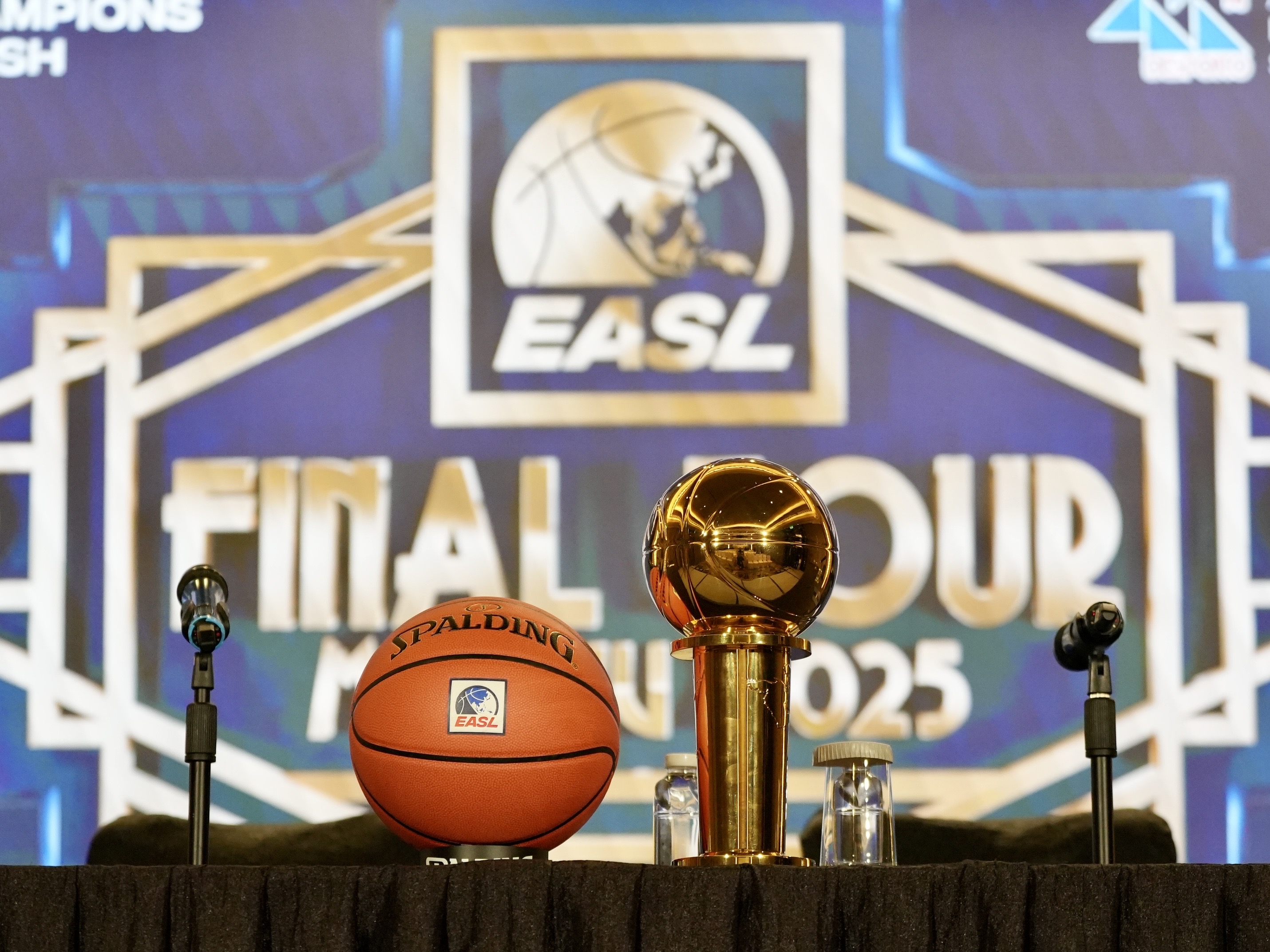 東超終極四強賽前記者會,擺上總冠軍盃。(李宇政攝)
