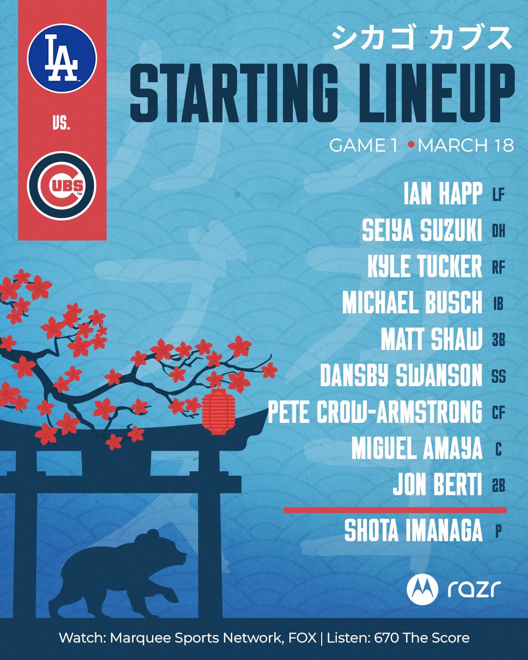 大聯盟2025小熊對道奇海外賽今在東京巨蛋開打!兩隊公布先發打線,道奇排出大谷翔平打第2棒、小熊則由鈴木誠也先發第2棒,先發投手為山本由伸對上今永昇太,海外賽很「日本」;另外,Mookie Betts因身體狀況不佳,確定無法出賽、道奇美韓混血Tommy Edmon則是先發第2棒,