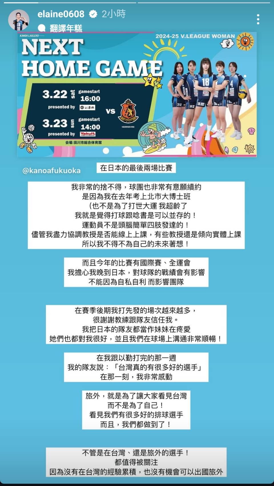 廖苡任去年8月宣布旅外,加盟日本V聯賽隊伍福岡Kanoa,去年12月更首度獲頒單場MVP,不過日前宣布因學業和國家隊活動考量決定離隊,今也在社群進一步透露暖心原因。