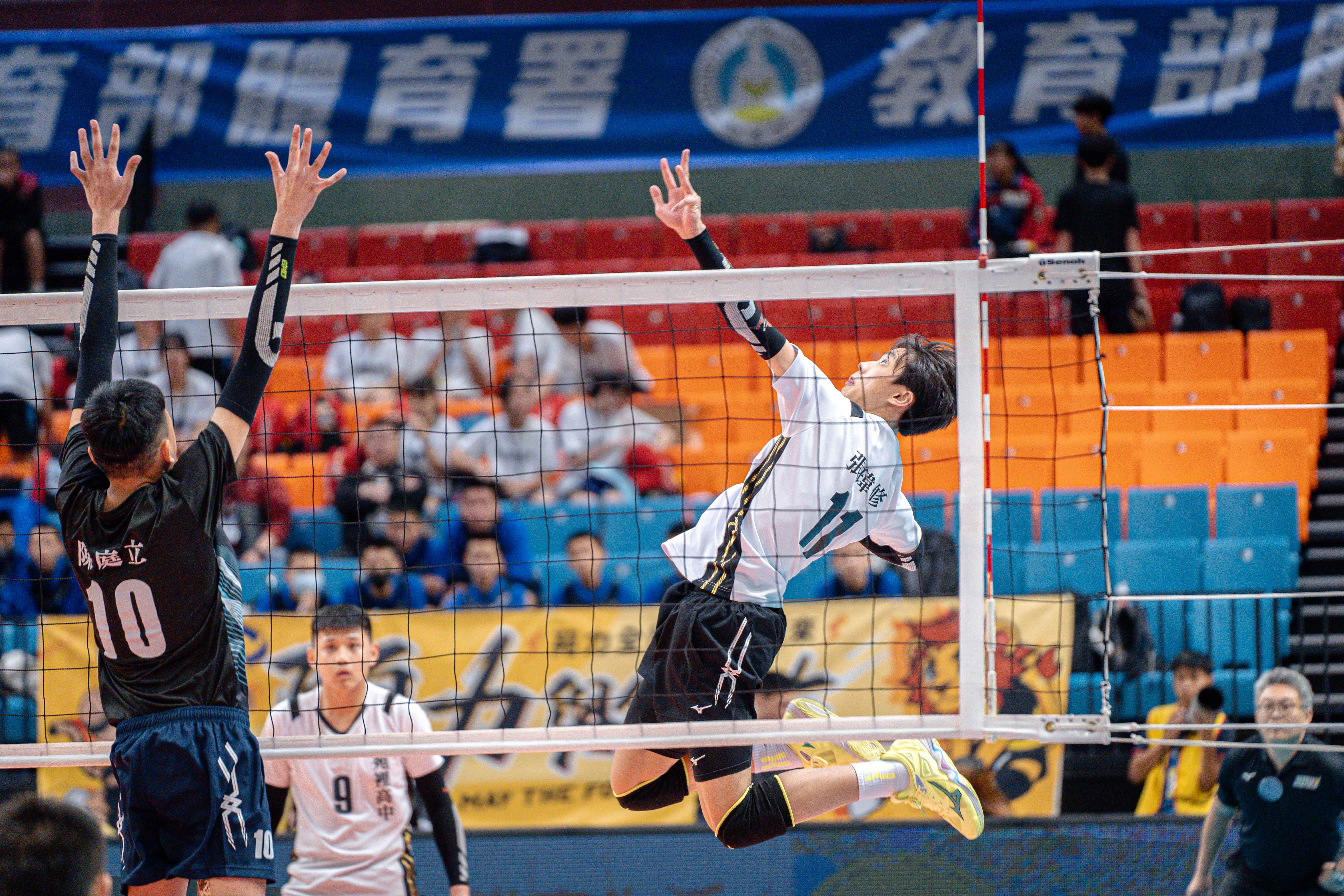 張瑋修躍起準備扣殺。(中華民國高級中等學校體育總會提供)