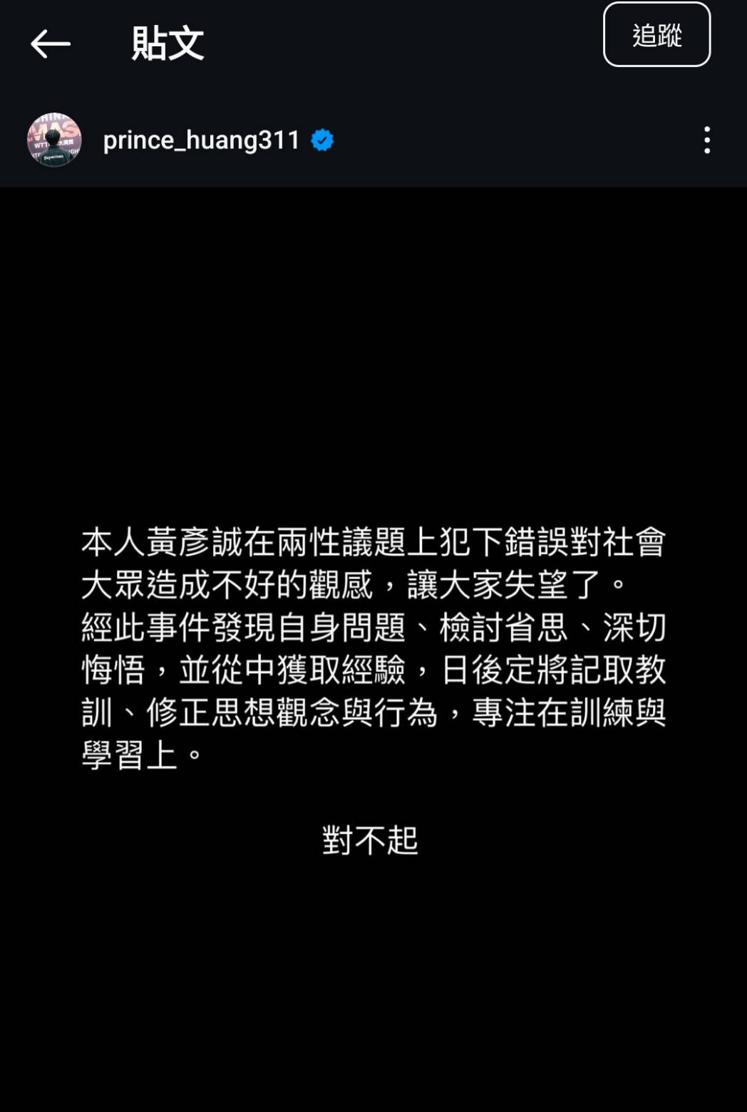 桃色風波爆發後,黃彥誠神隱多日昨天在社群平台首度發聲,內文提到,「在兩性議題上犯下錯誤對社會大眾造成不好的觀感,讓大家失望了。經此事件發現自身問題、檢討省思、深切悔悟、並從中獲取經驗,日後定將記取教訓、修正思想觀念與行為,專注在訓練與學習上,對不起。」
