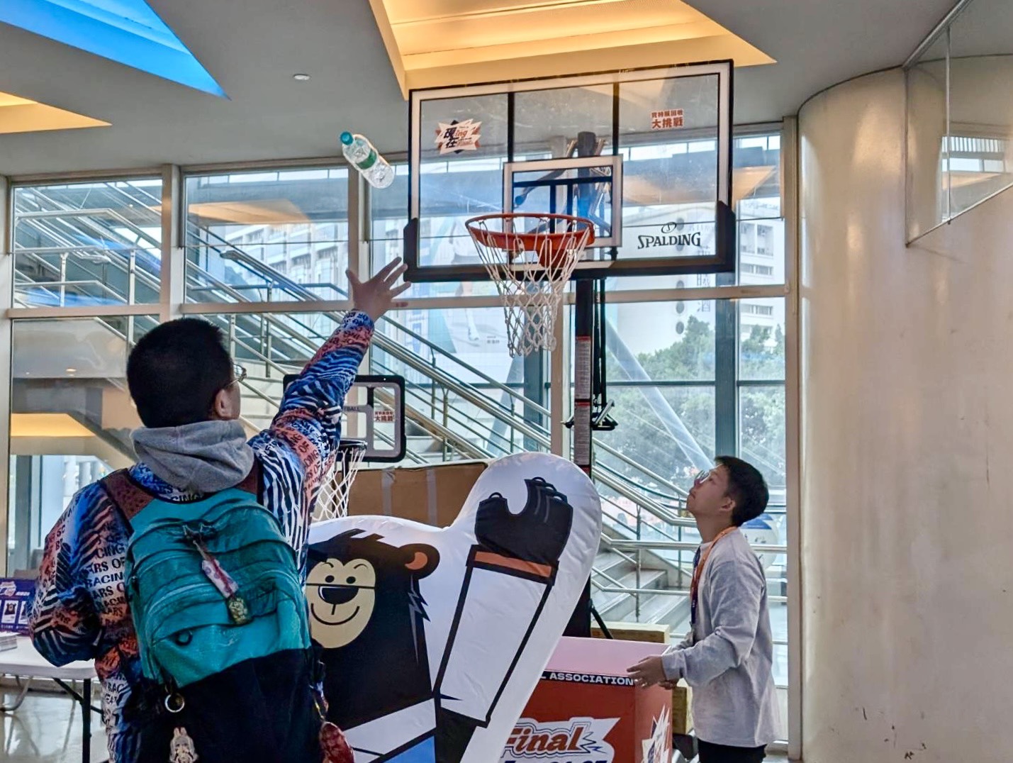 現場也持續設立「寶特瓶回收區」結合投籃遊戲,只要球迷拿寶特瓶前來回收,並將寶特瓶投進籃框內,即可獲得一張可愛督瑪熊貼紙,吸引不少球迷排隊小試身手,更有小朋友拿到貼紙後直呼「好可愛」。