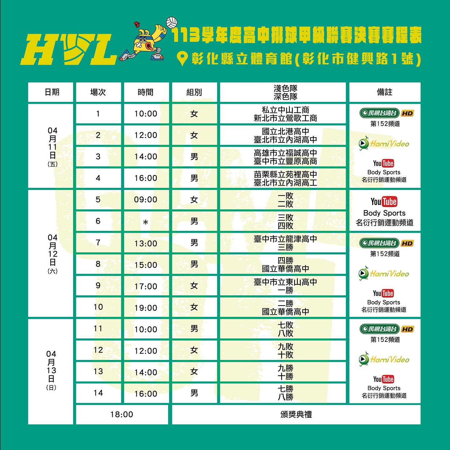 HVL決賽將於4月11日起一連三天,在彰化縣立體育館進行最後的男、女六強決賽,這也是HVL決賽首度移師到彰化縣立體育館進行。