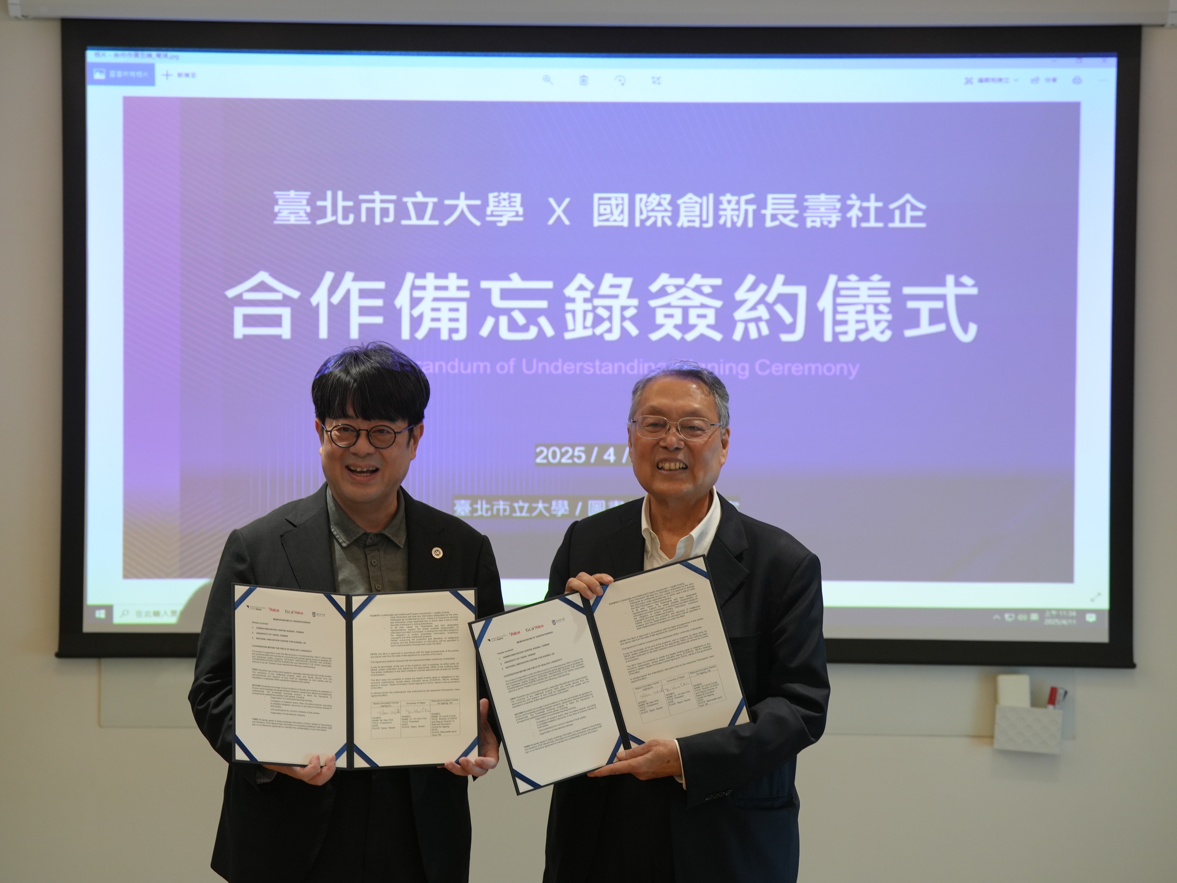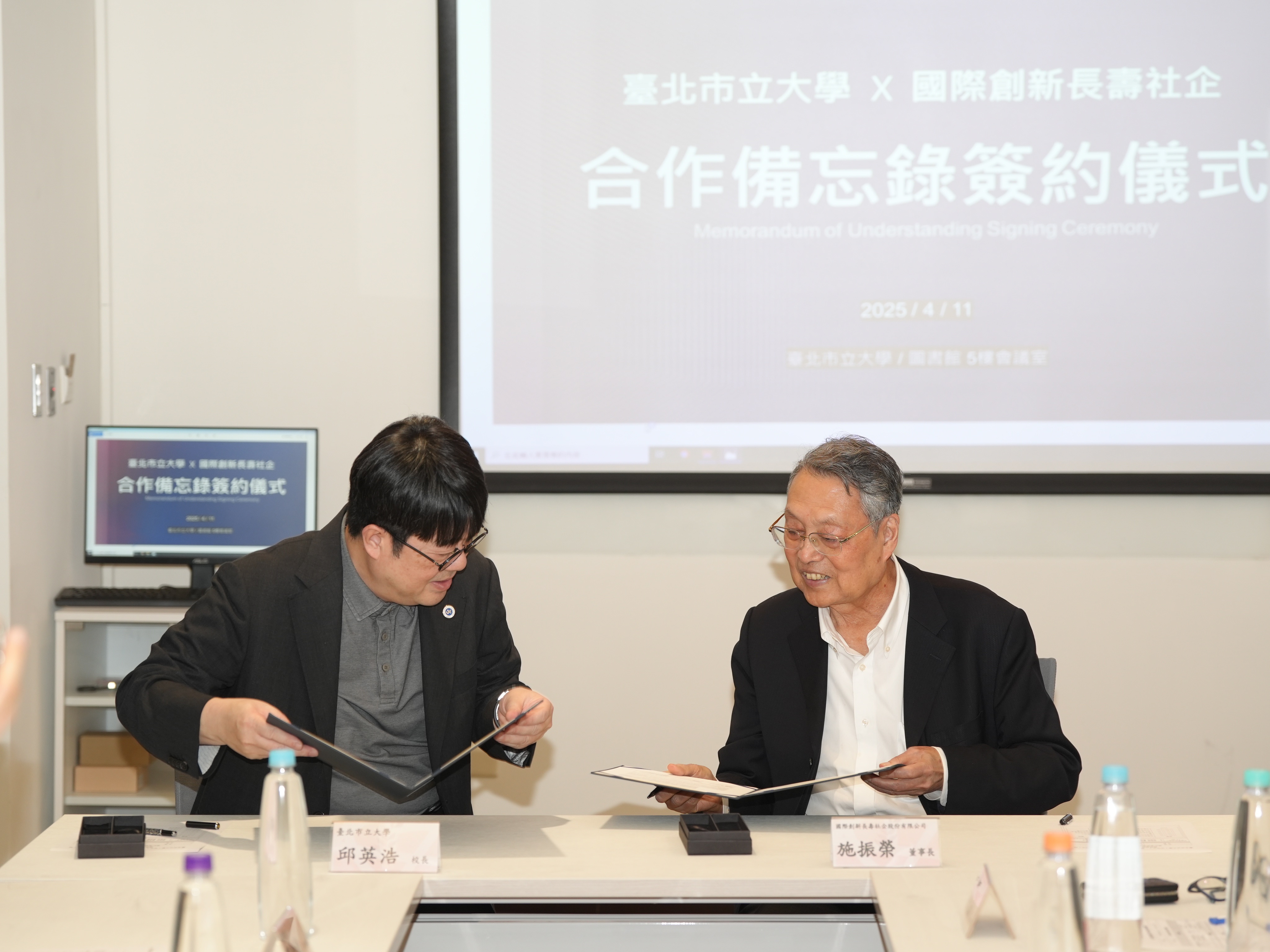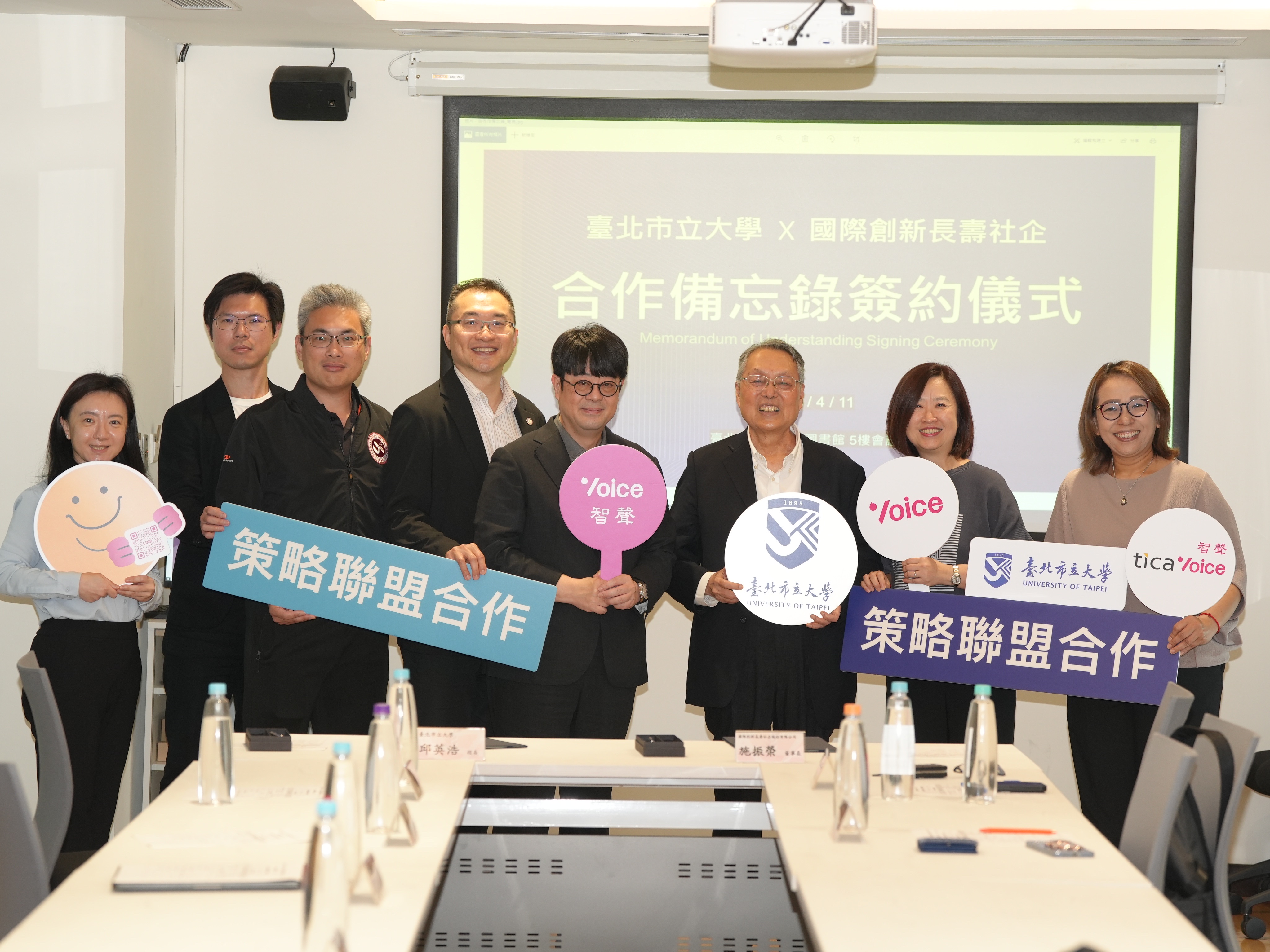 出席簽署儀式的有臺北市立大學邱英浩校長、施振榮、國際創新長壽社企(TICA)執行長李安鈴、國際創新長壽社企(TICA)副總監徐薇芝。