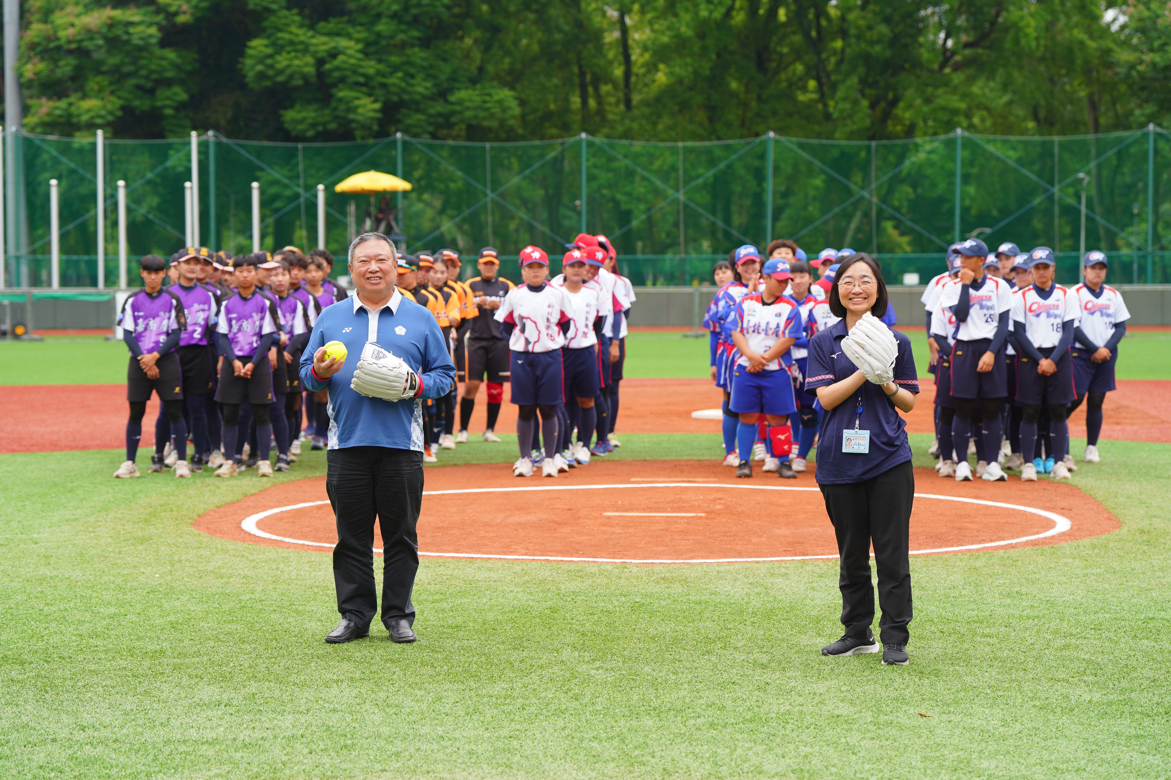 中華奧林匹克委員會主席林鴻道、臺北市體育局長游竹萍為企業聯賽開幕戰開球。(中華民國壘球協會提供)