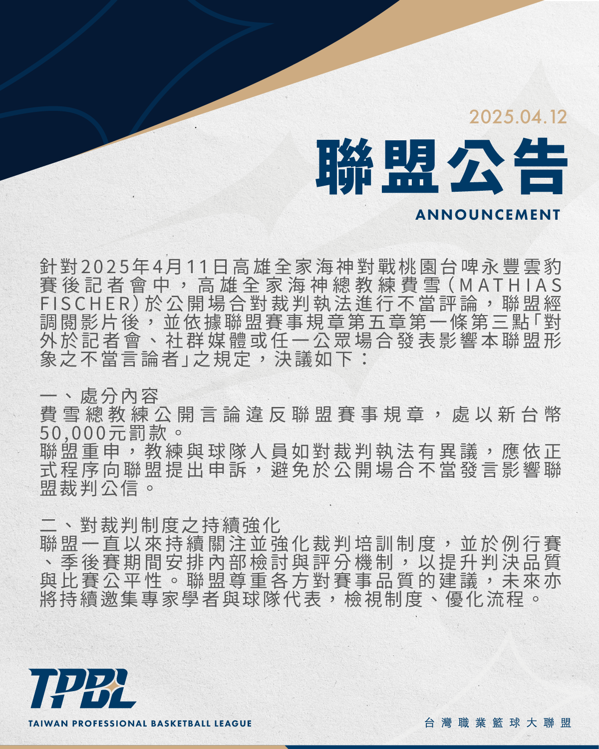 針對2025411日高雄全家海神對戰桃園台啤永豐雲豹賽後記者會中,高雄全家海神總教練費雪(Mathias Fischer)於公開場合對裁判執法進行不當評論,聯盟經調閱影片後,並依據聯盟賽事規章第五章第一條第三點「對外於記者會、社群媒體或任一公眾場合發表影響本聯盟形象之不當言論者」之規定,決議如下: