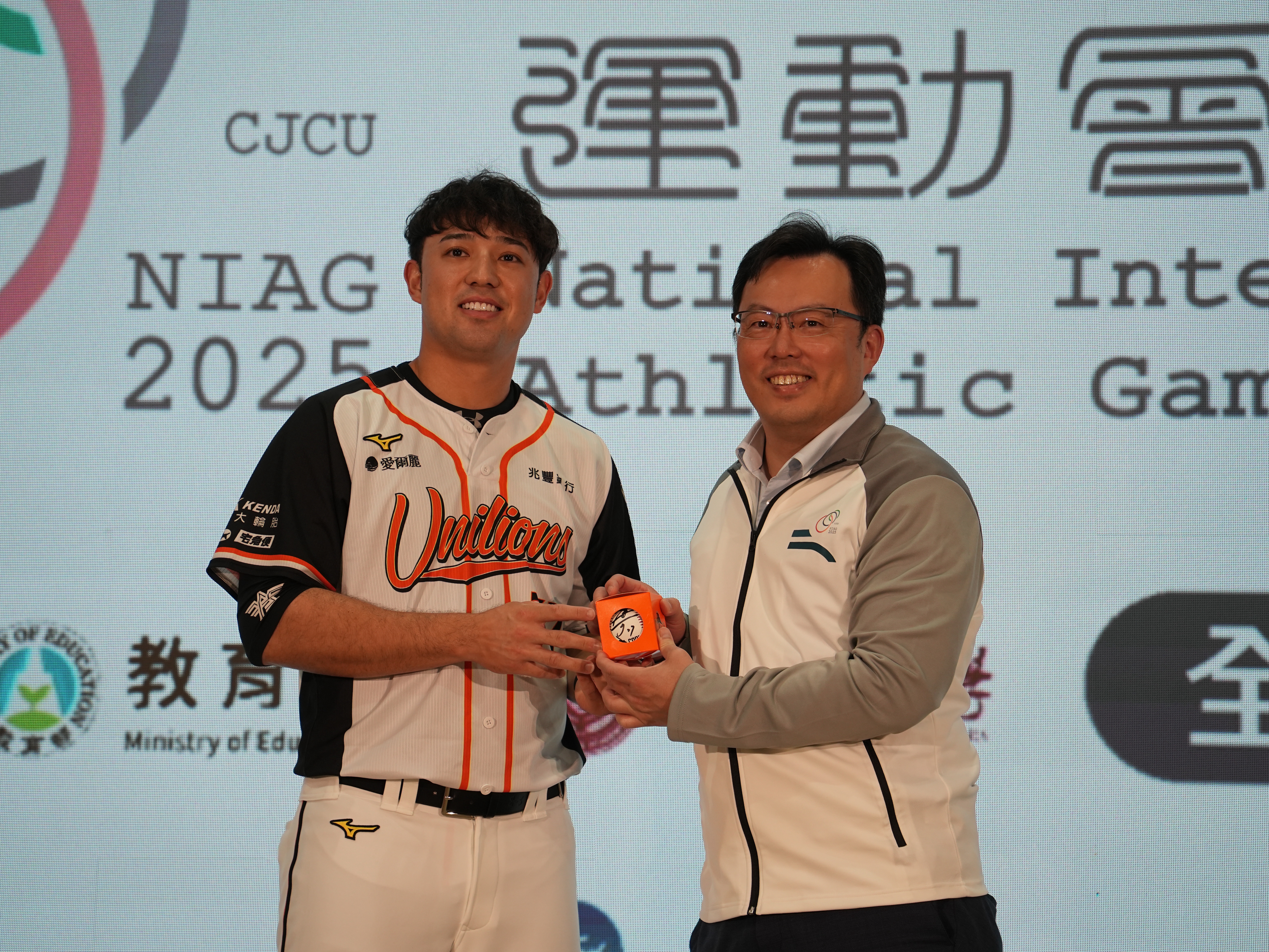 林安可致贈簽名球予教育部體育署署長鄭世忠。(長榮大學114全大運執辦提供)
