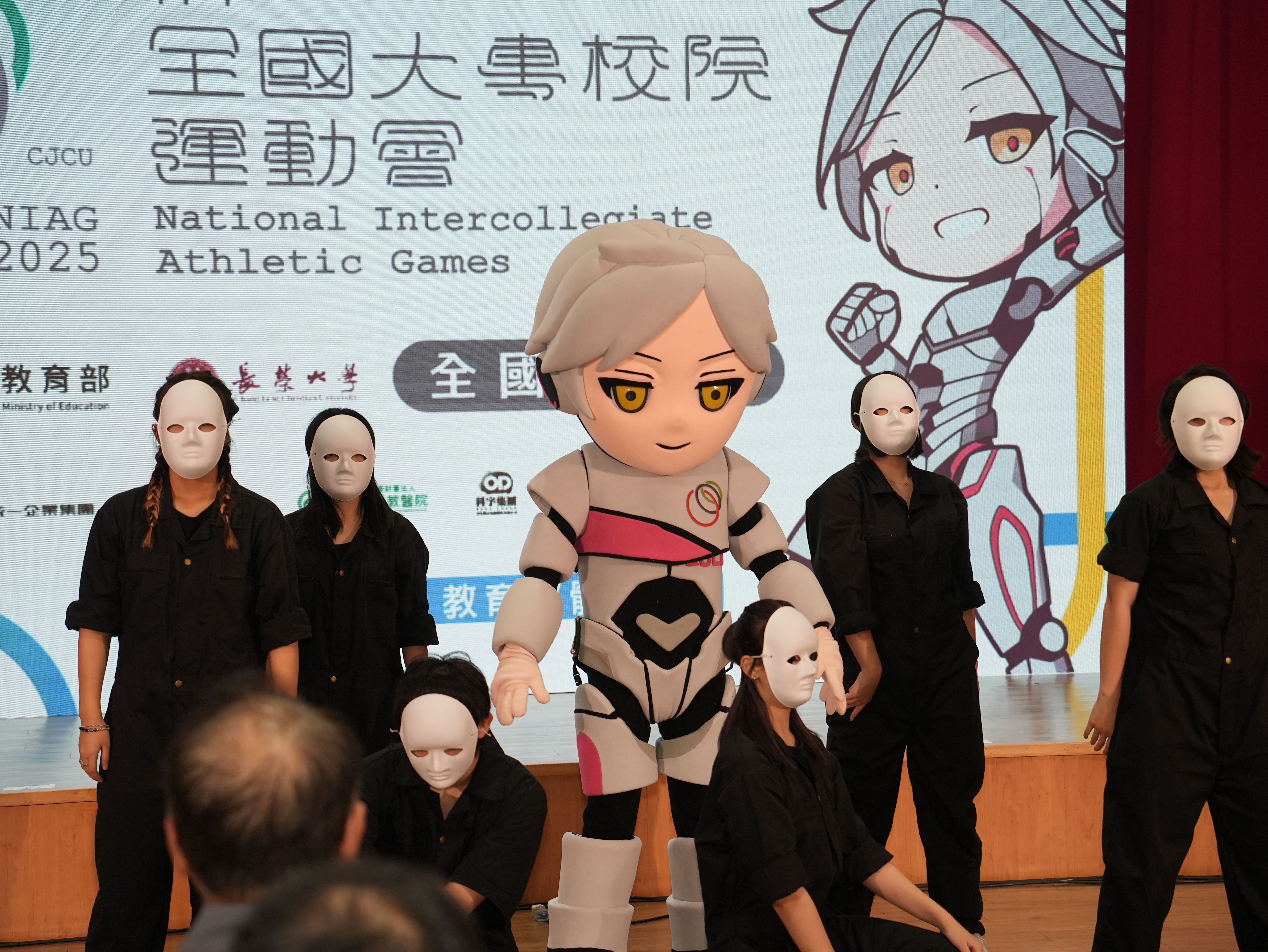 長榮大學DDC熱舞社與本屆全大運吉祥物路修斯在全國記者會熱舞開場。(長榮大學114全大運執辦提供)