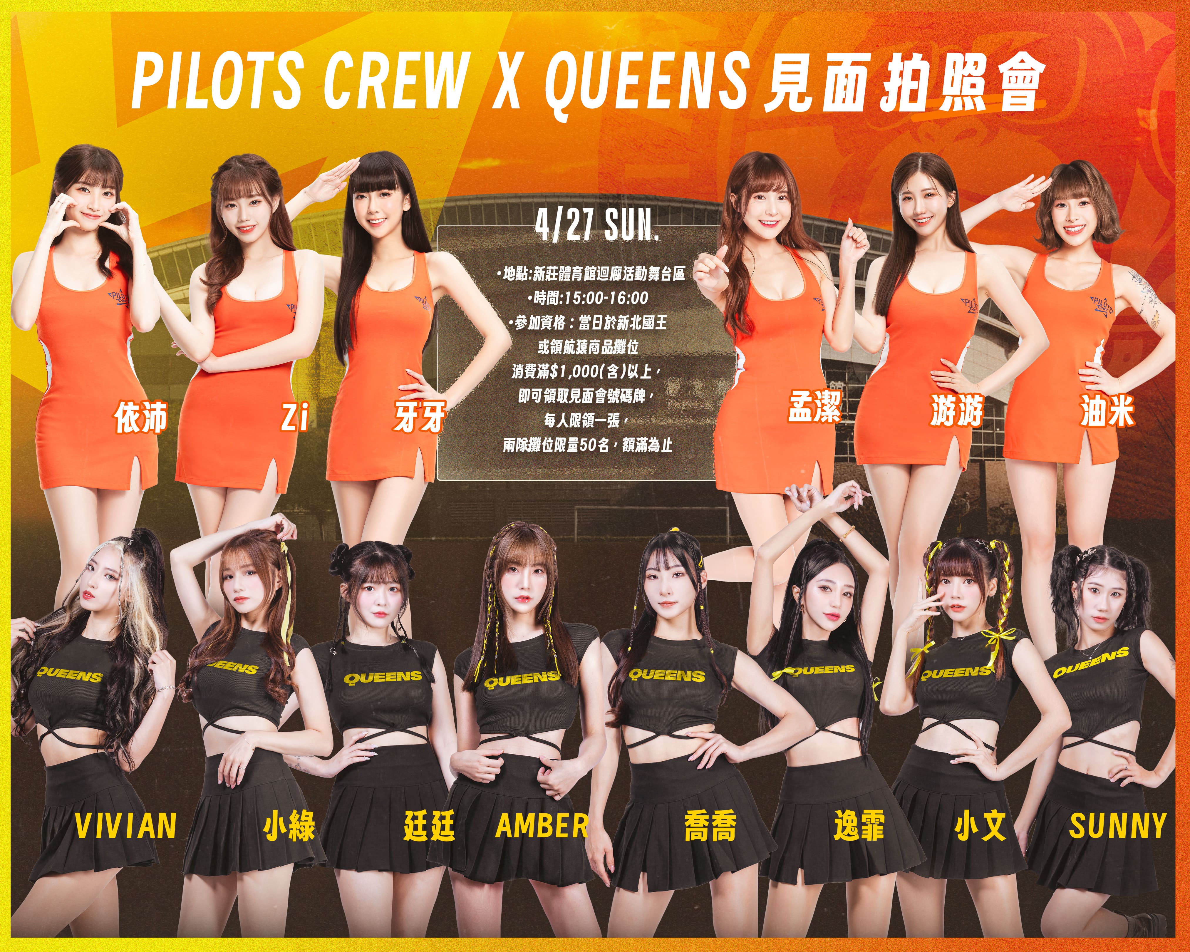 Pilots Crew甜美空姐「孟潔、游游、牙牙、油米、依沛、Zi」,以及New Taipei Queens最辣女孩「Amber、喬喬、Sunny、小文、小綠、Vivian、逸霏、廷廷」,兩隊「嬌」點將在4月27日賽前一起互動同樂。