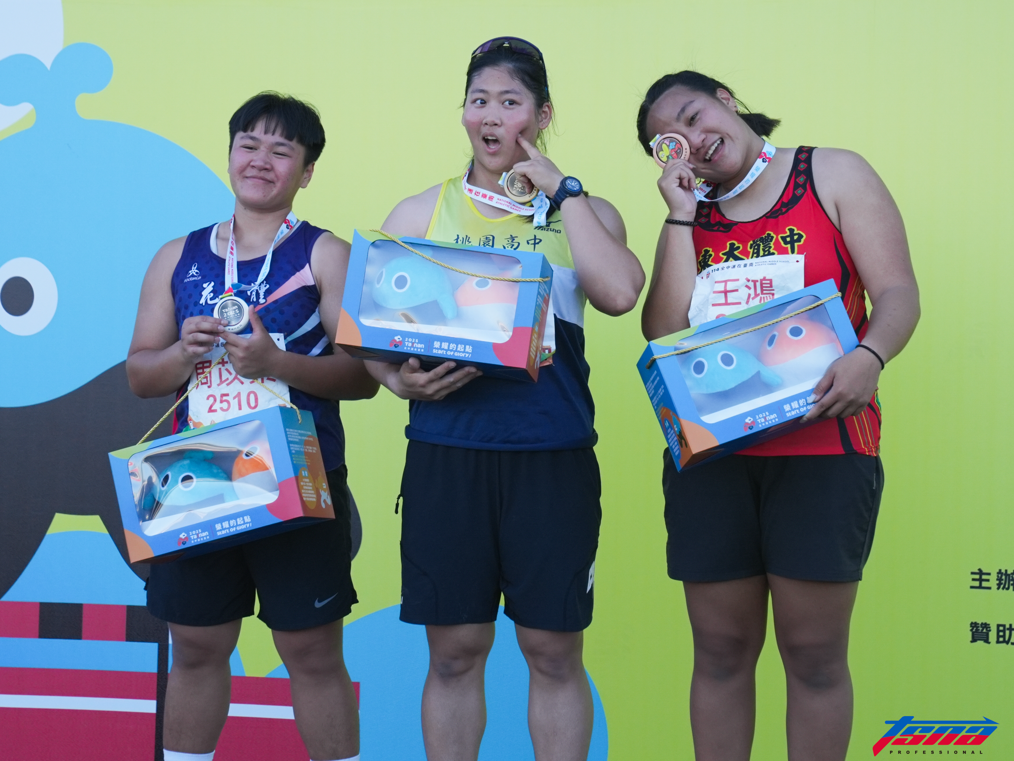個性活潑外向江靜緣(中)與銀牌花蓮縣體育中學周苡蓁(左)、銅牌臺東縣東大體中王鴻在頒獎台合影。(黃以信/攝)