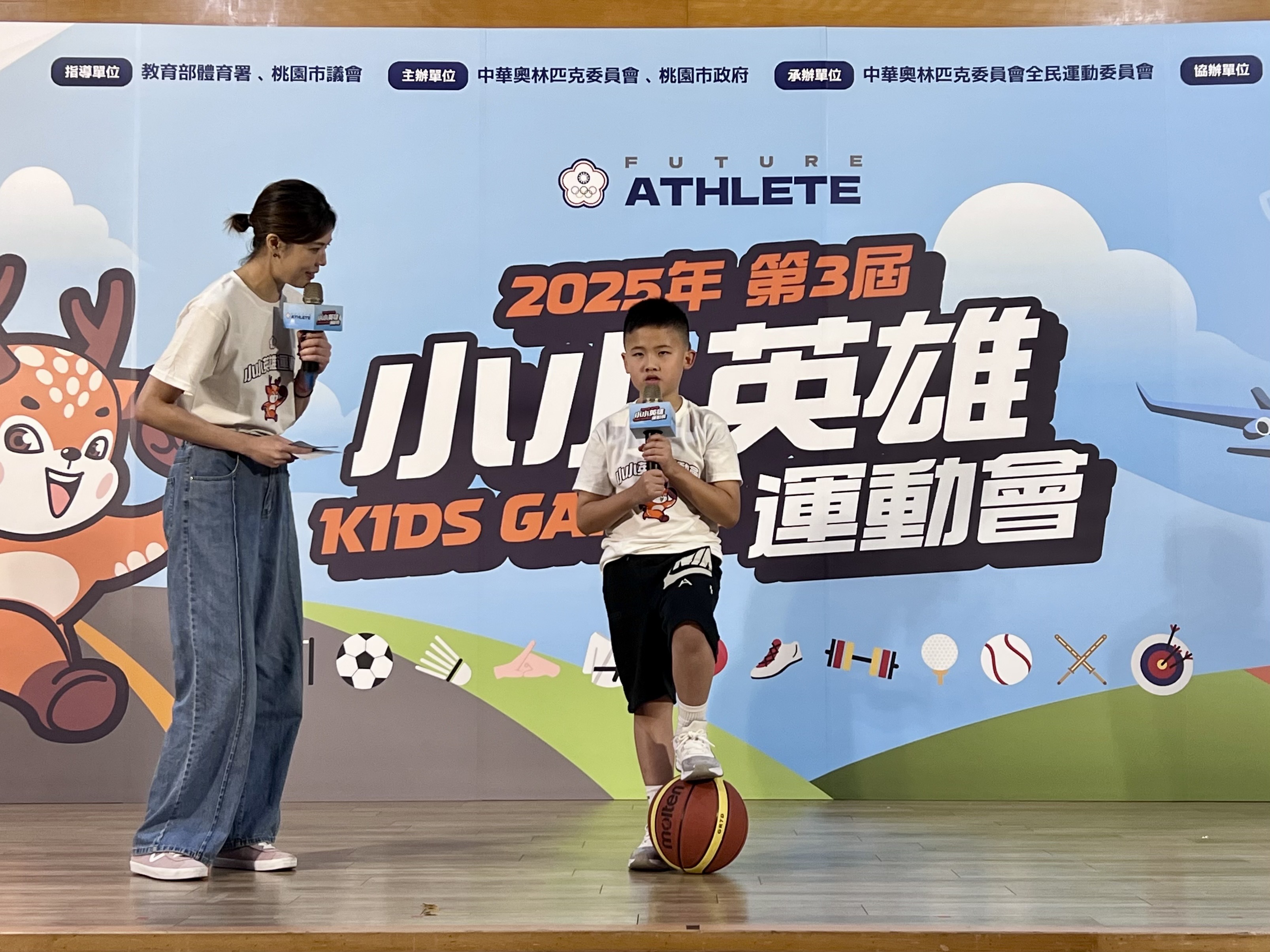 中華奧會今天舉辦「2025年中華奧會第3屆小小英雄運動會」記者會,臺北富邦勇士籃球隊總教練許晉哲的9歲兒子許鈞崴,帶顆籃球上台擔任活動大使,並童言童語的號召,「你們趕快來參加,這邊可以交很多新朋友,也可以跑來跑去,這樣會很開心!」