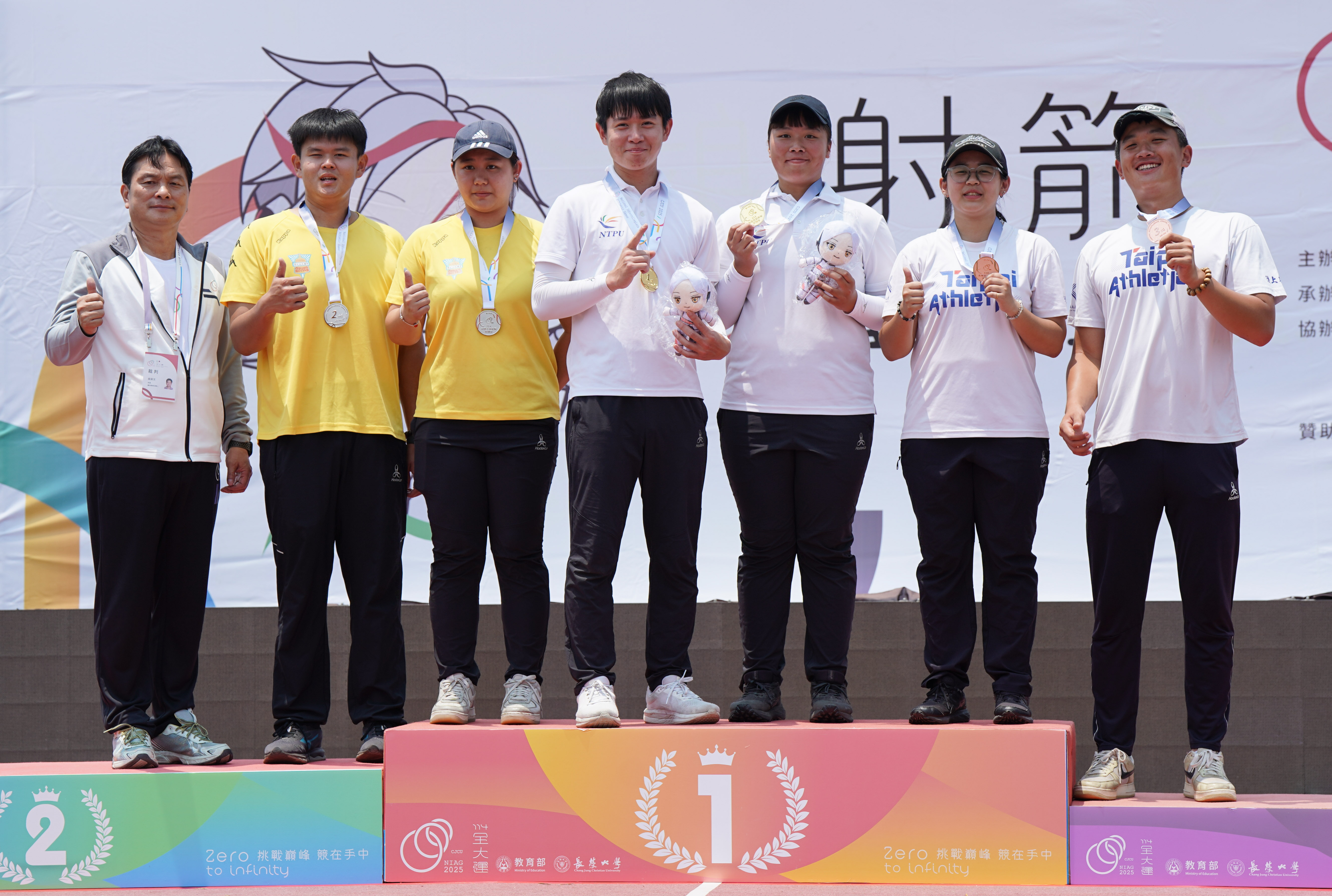陳思妤(右3)、林昱圻(右4)奪得本屆全大運複合弓混雙金牌,2人都是大學才由反曲弓轉弓種。(中華民國大專院校體育總會提供)