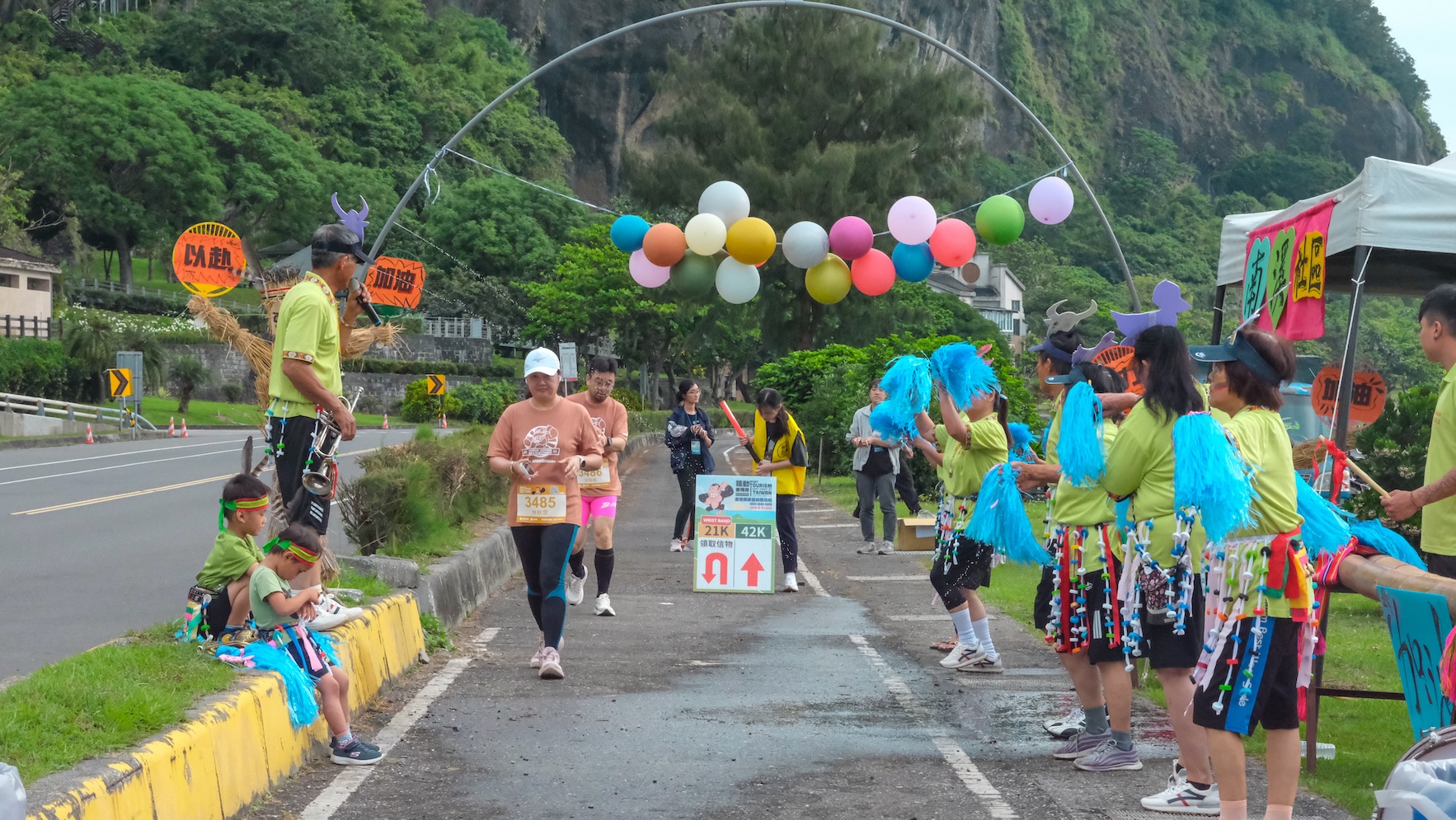 選手們紛紛駐足拍照、排隊品嚐,氣氛熱絡。賽道補給也展現豐富的在地特色,從藏濱白蝦、山豬肉香腸、小米甜甜圈,到與在地店家合作提供的小番茄、冰咖啡、燕麥餅、金剛鮪魚糖與酥炸鬼頭刀,補給內容豐盛多元,深獲選手好評。此外,由各部落組成的特色啦啦隊也以熱情應援與創意造型,沿途為選手加油打氣,增添比賽趣味與人情溫度。