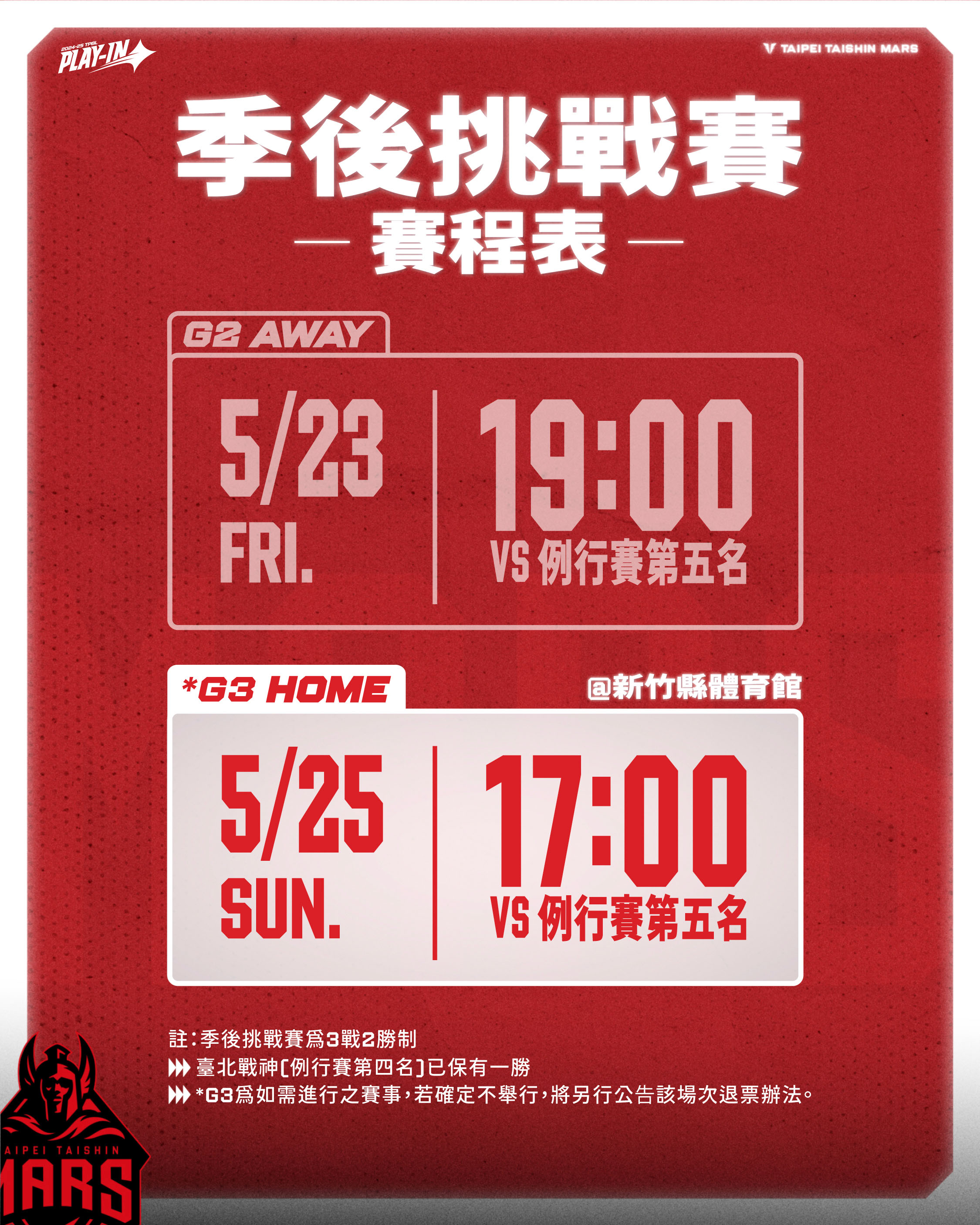 若未能取勝,臺北戰神表示,將於5月25日舉行主場賽事,因逢2025雙北世界壯年運動會期間,原主場臺北和平籃球館為賽會場館無法使用,賽事將移師新竹縣體育館進行,本次也祭出雙城應援優惠,臺北市民購票享五折、新竹縣市民皆享八折。