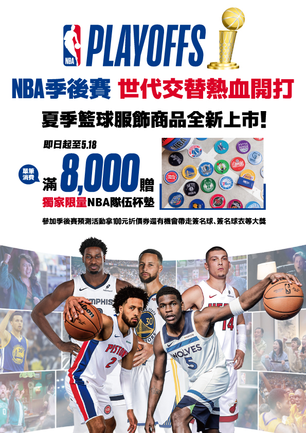 為感謝廣大球迷朋友的支持,NBA Store於季後賽期間祭出期間限定活動!即日至5月18日,實體門市單筆消費滿$8,000元即贈獨家限量「NBA隊伍杯墊」;同時至實體門市消費還可參加「NBA季後賽預測活動」,獎項包括優惠券、NBA球星簽名球、簽名球衣等大獎。今年夏天,就用NBA球衣穿搭開啟你的Playoff專屬應援模式,熱血迎戰每一場關鍵時刻!