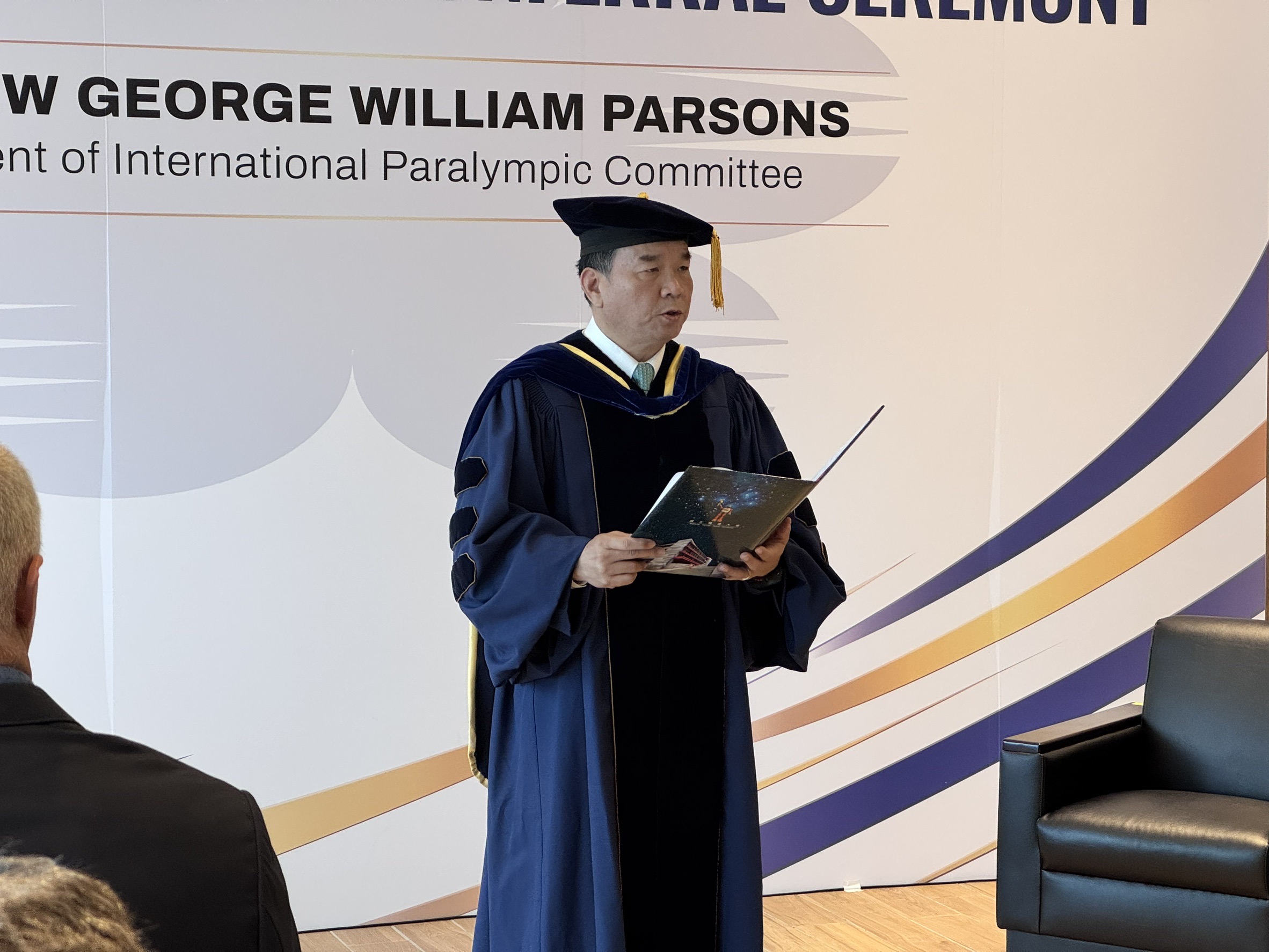 頒授儀式上,國立體育大學邱炳坤頒授學位肩巾以及學位證書給予Parsons。教育部體育署長鄭世忠、中華帕拉林匹克總會會長穆閩珠也到場祝賀,