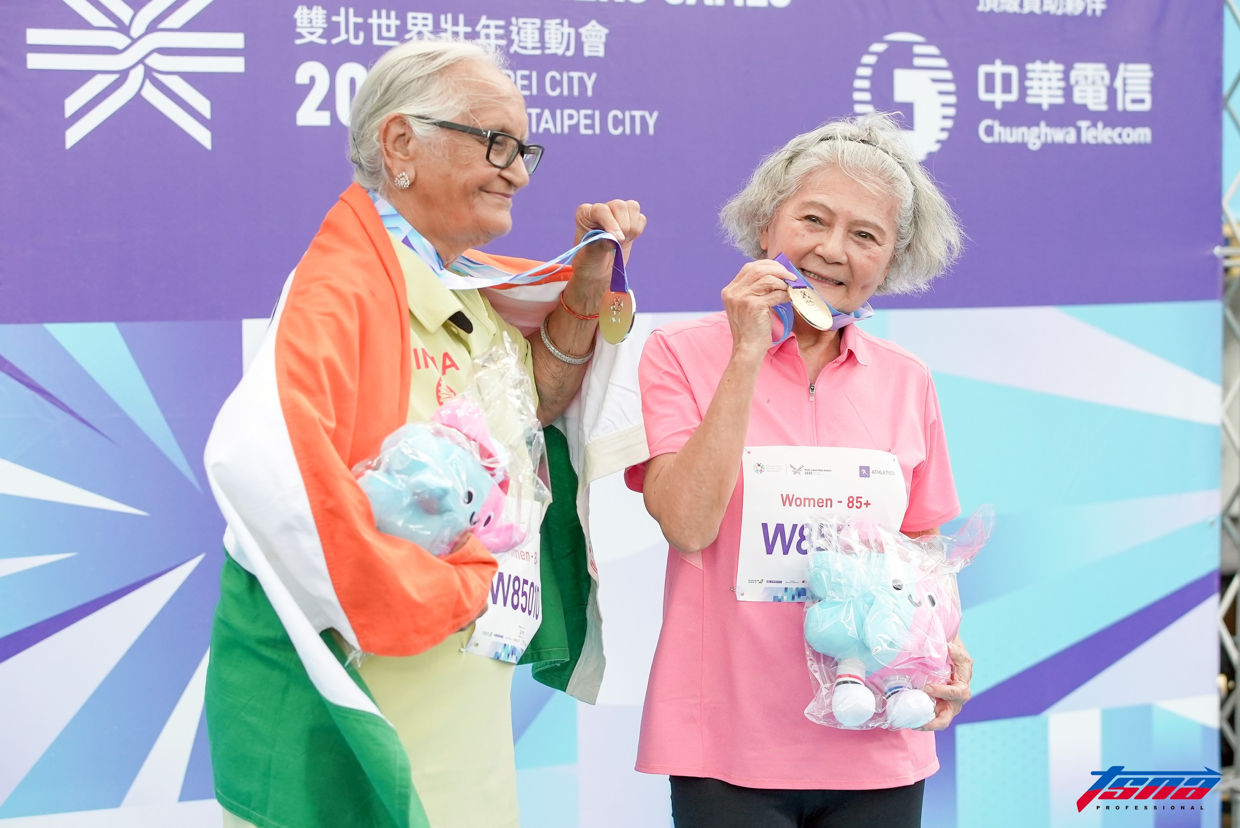 林潘秀雲(右)、印度Usha Sharma分別獲得女子100公尺85歲以上組金、銀牌。(王偉丞/攝)