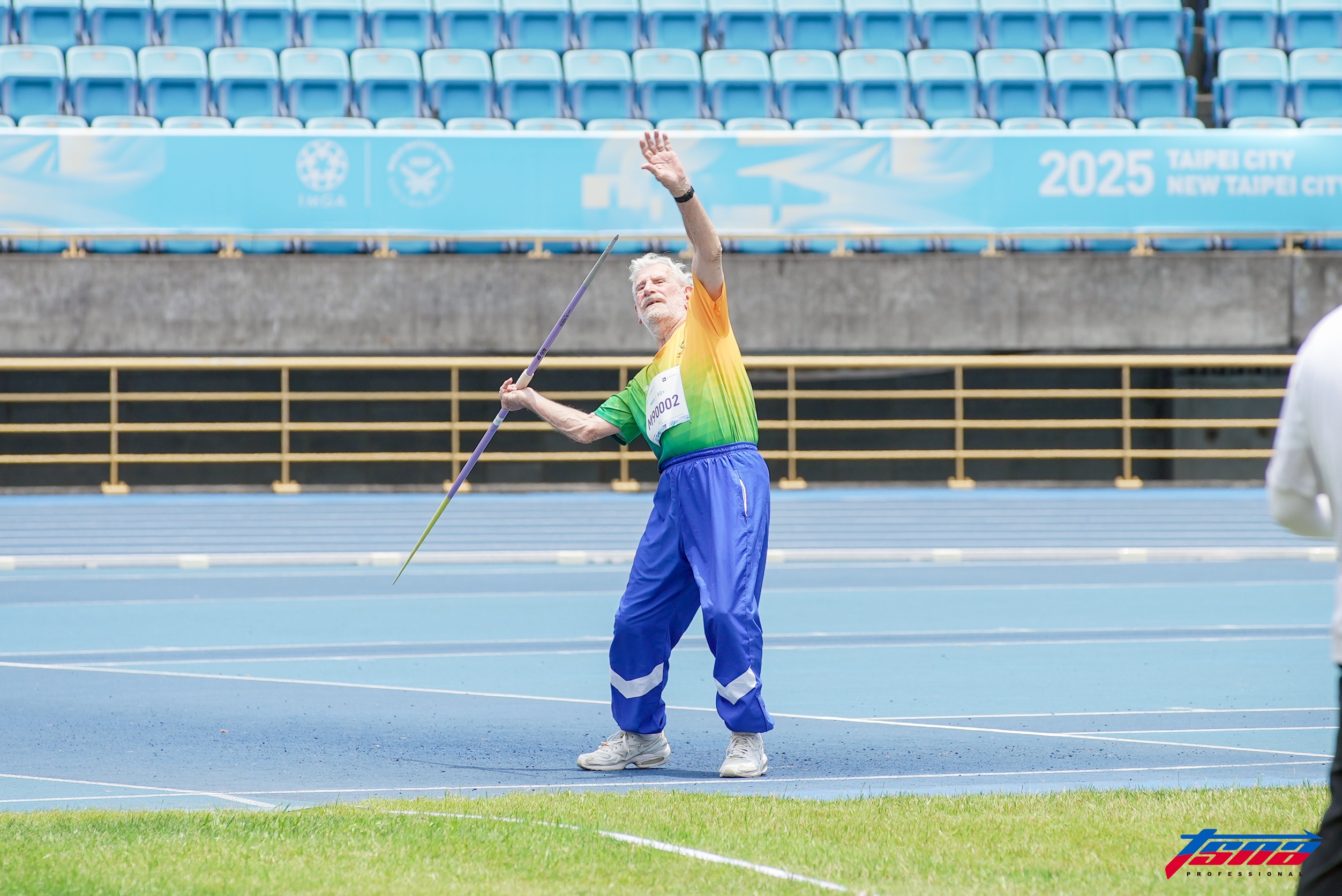 2025雙北世界壯年運動會田徑場亮點之一就是藝人昆凌(Hannah Quinlivan)高壽90歲祖父Laurence James Quinlivan,他今天上午在男子標槍90歲以上組摘金,下午在男子90歲以上組奪銀,他也分享,自己雖不吃綠色食物,但長保愉快心態加上運動就能保持長壽與活力。