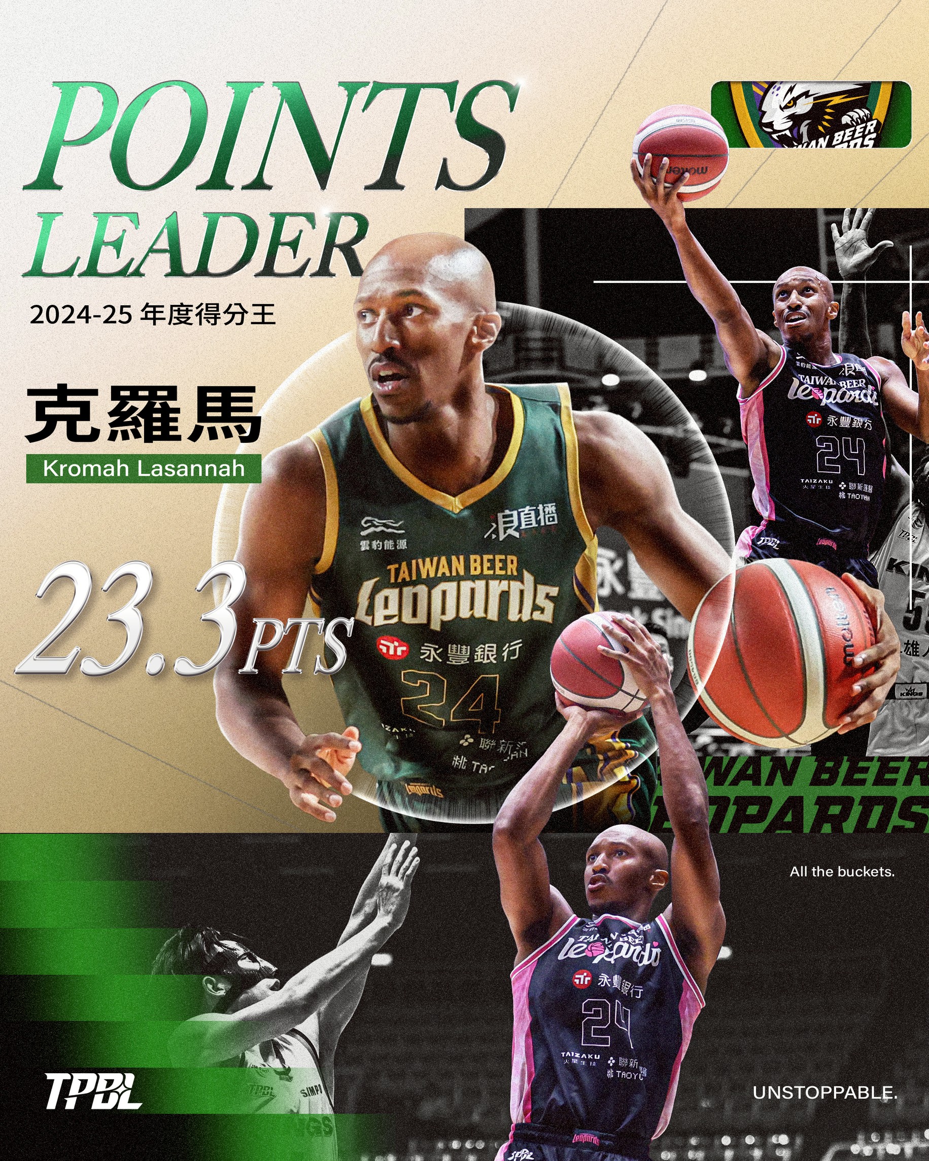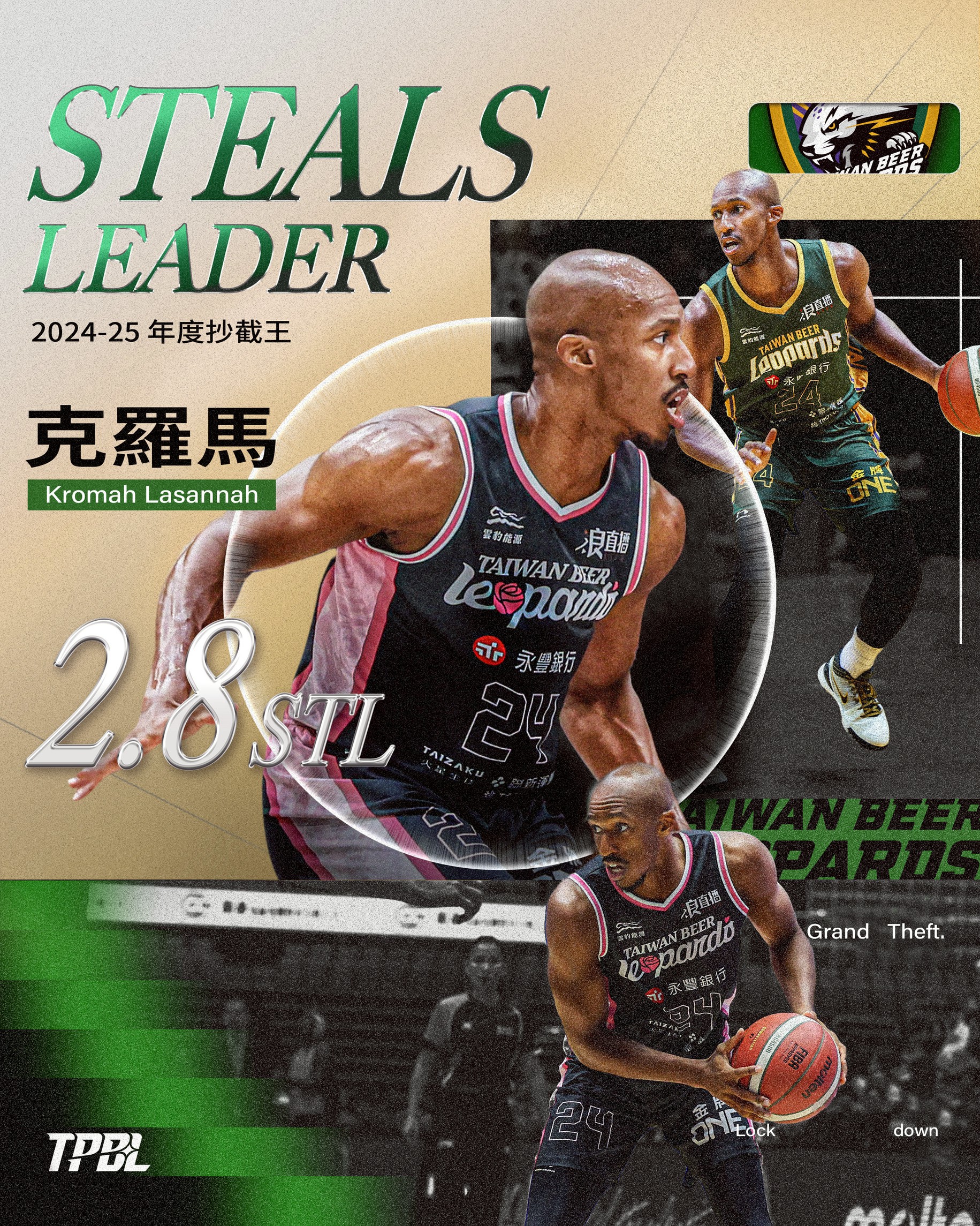 Kromah),繼上季於T1聯盟勇奪得分王與抄截王後,本季再度於TPBL完成雙冠壯舉。他以場均23.3分與2.8次抄截,穩居聯盟雙項之首。