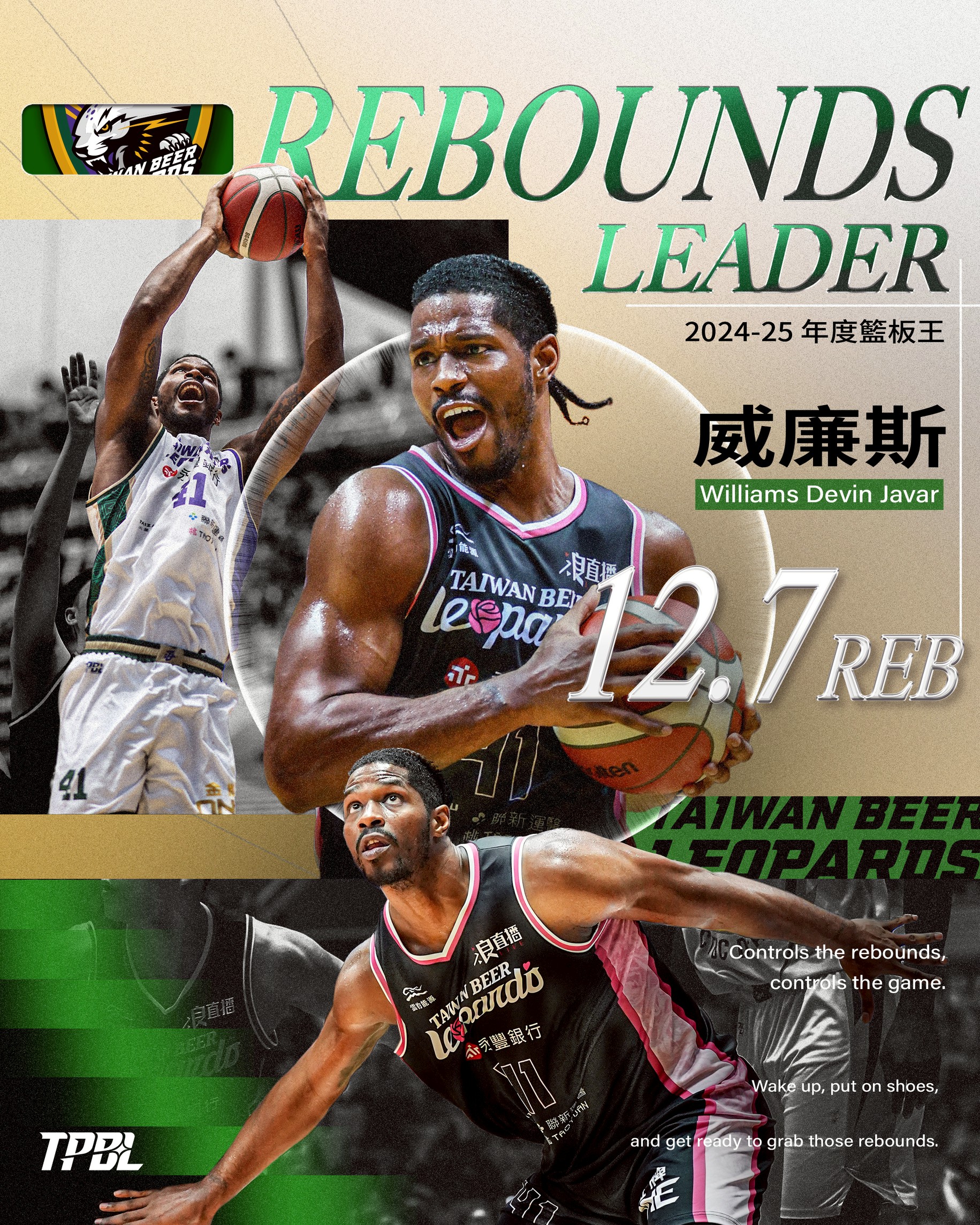 克羅馬的好搭檔威廉斯(Devin Williams),則以場均12.7籃板拿下個人於台籃的第二個籃板王獎盃,再次證明他在禁區的統治力與強悍。威廉斯本季近乎繳出場場雙十的成績單,其中,2024年12月7日對戰新北中信特攻時,更是抓下23顆籃板,刷新TPBL單場紀錄。