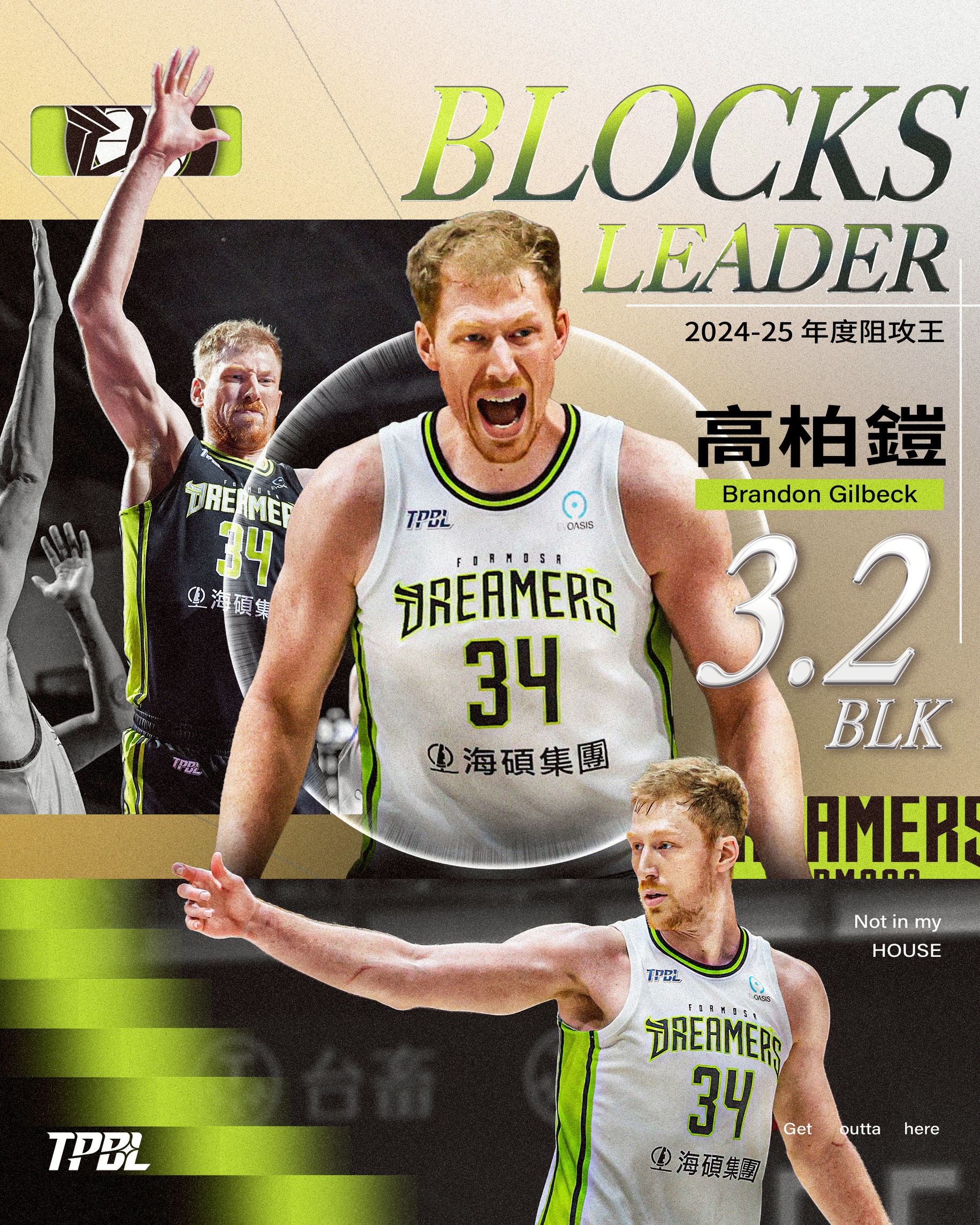 福爾摩沙夢想家中鋒高柏鎧(Brandon Gilbeck)則以場均3.2次阻攻,遙遙領先群雄,奪得本季阻攻王。他已曾三度在PLG獲封阻攻王頭銜,轉戰TPBL依舊展現強大護框能力,證明他的實力無論在哪個舞台都具備宰制力。