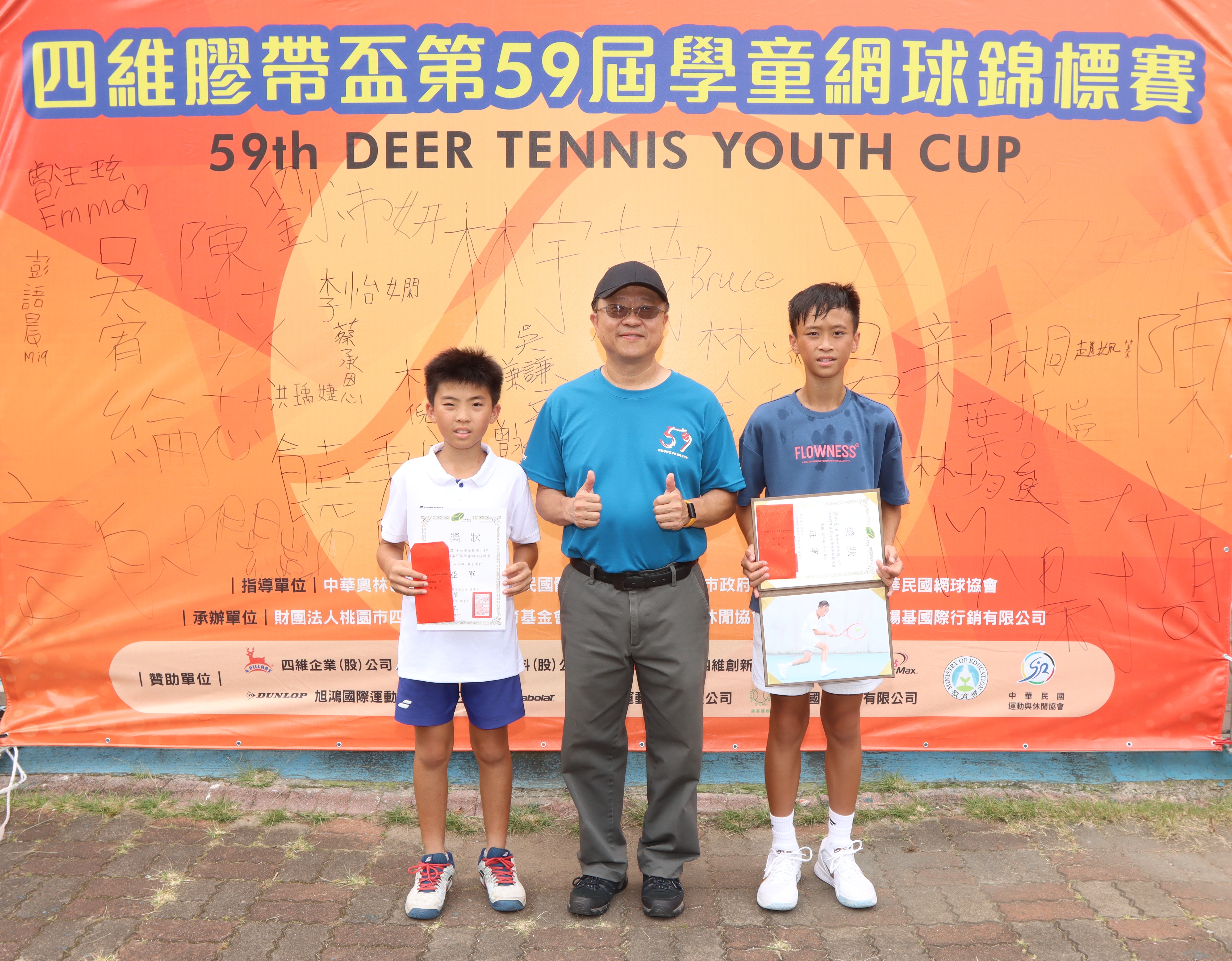 四維基金會董事長楊蔚萌(中)頒獎給五男冠亞軍蔡承恩(右)、吳謙立(左)。四維體育推廣教育基金會提供