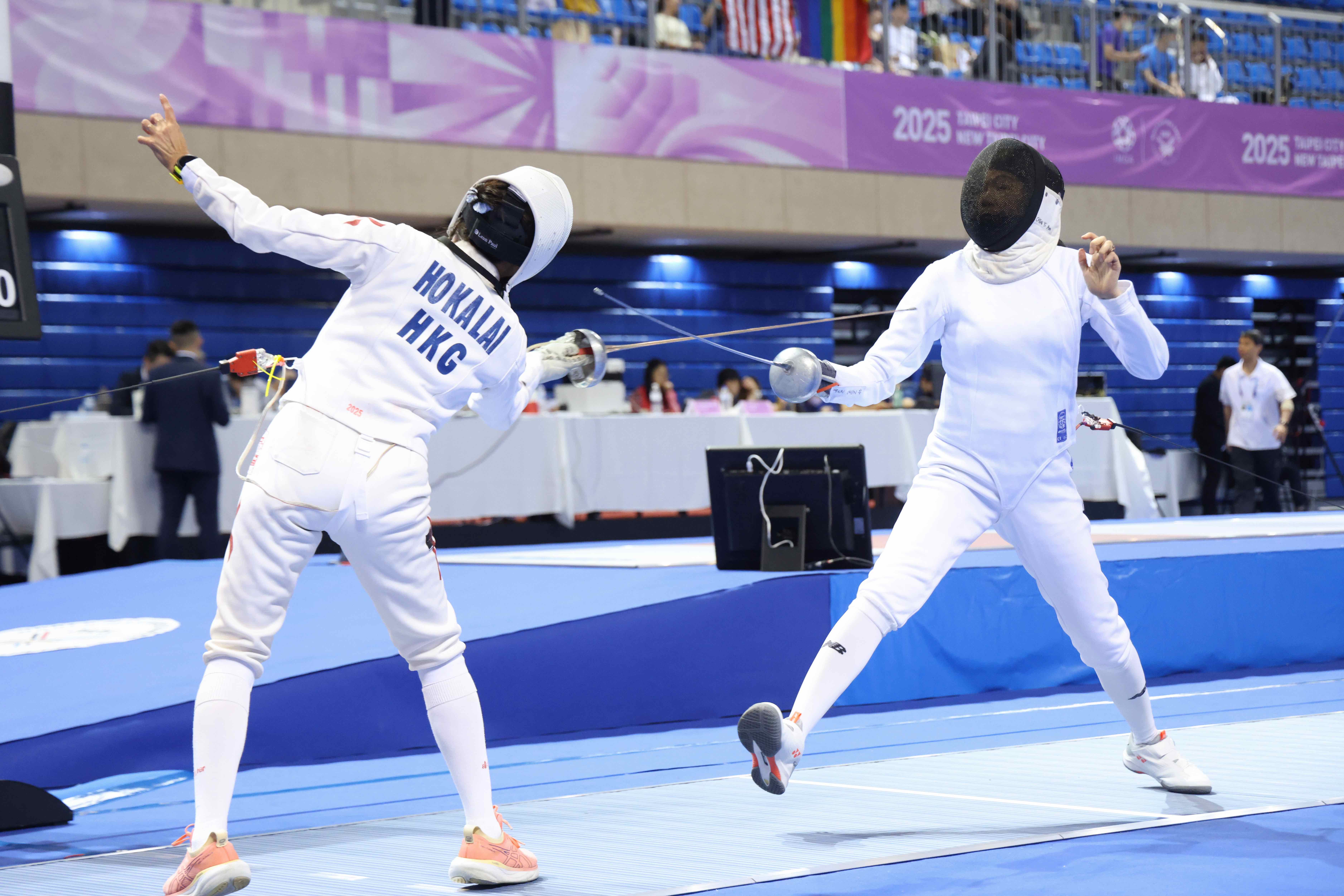 陳怡安(右)對香港釜山亞運女子銳劍團體銅牌何嘉麗。(2025雙北世界壯年運動會提供)