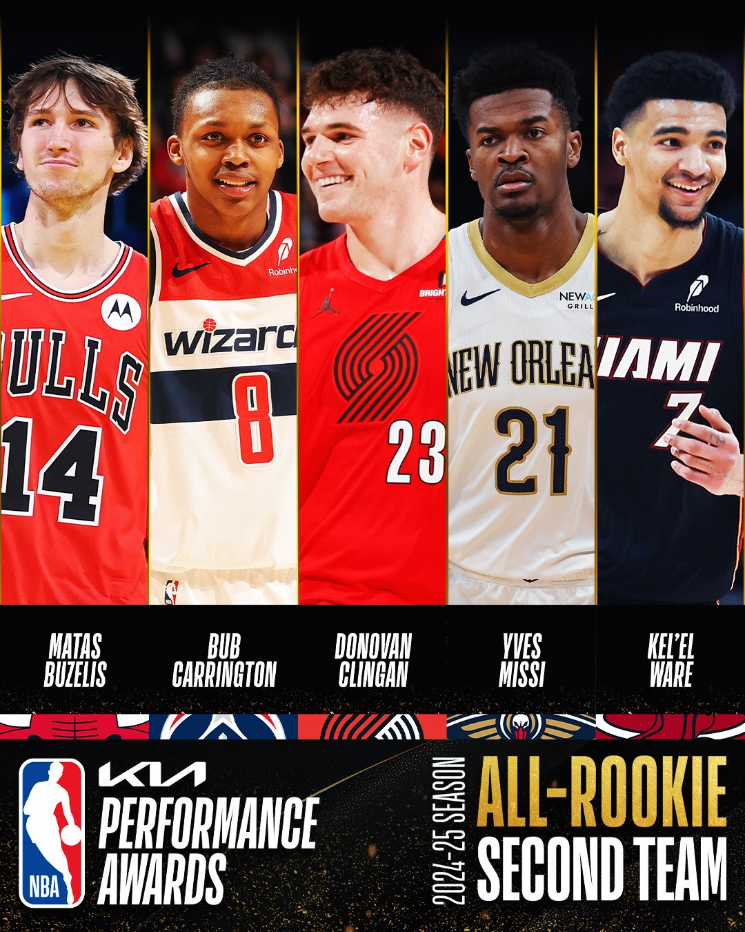 年度第二隊依序為熱火中Kel’el Ware、公牛前鋒Matas Buzelis、鵜鶘中鋒Yves Missi、拓荒者中鋒Donovan Clingan、巫師後衛Bub Carrington。