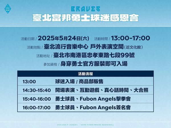 勇士球員們及Fubon Angels都將出席與大家近距離互動,參加資格是身穿勇士服飾即可入場