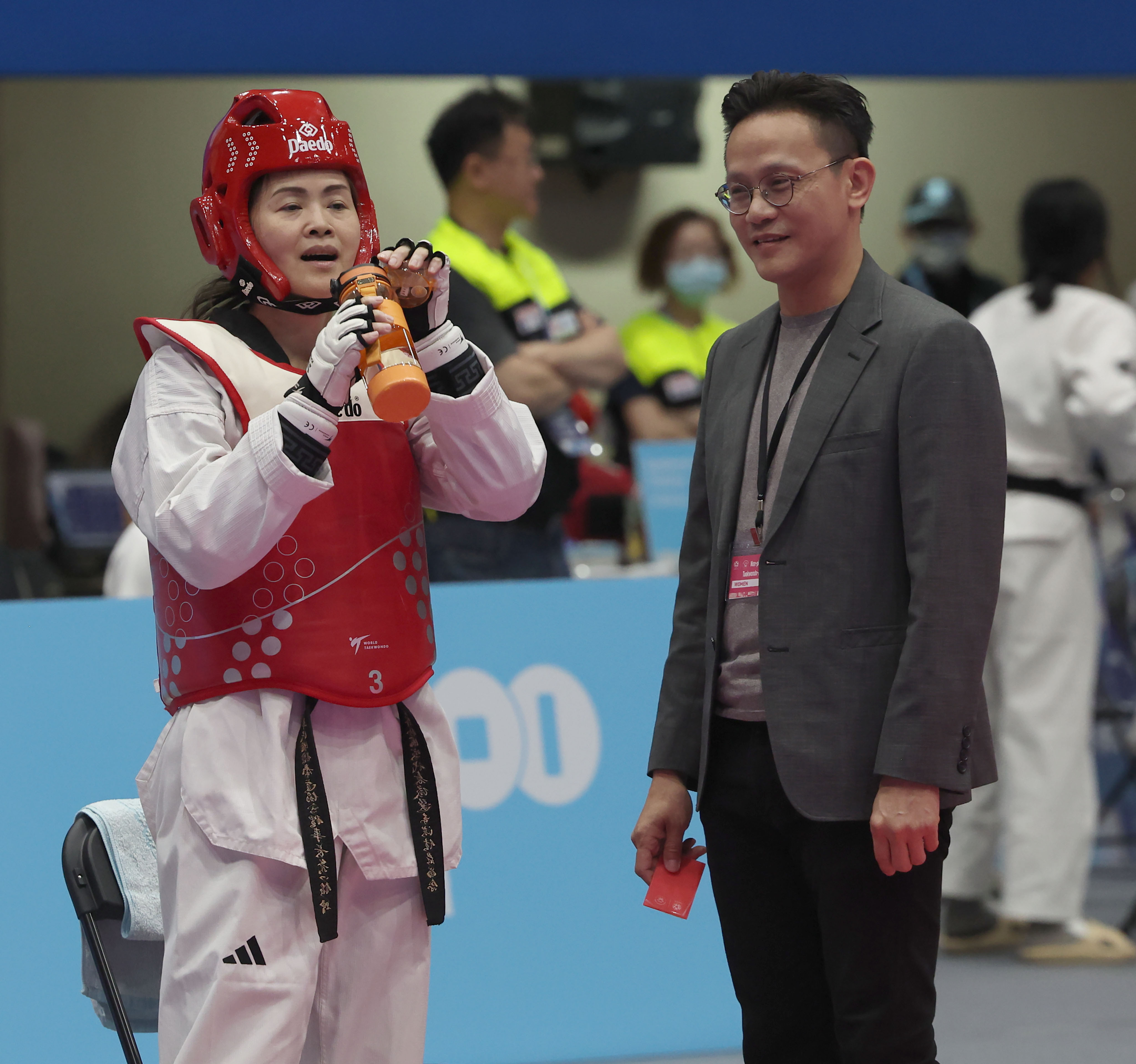 前跆拳道國手黃志雄這次擔任前國手、也是太太洪佳君的教練,洪佳君首戰以5:3、5:2擊退哥倫比亞Urrego Montoya,「雄哥」黃志雄賽後笑說,洪佳君現在實力大概只有當年的3成不到,「當教練總是比較嚴苛,不過20年沒比賽,已經表現不錯。」洪佳君不僅親自下場拼搏,也積極推廣賽事,她說,鼓勵身邊的人報名參加,所以自己也要下場比賽,重回賽場就像是一場夢,世壯運比賽氛圍真的很棒,賽後也邀請對手參加閉幕儀式。