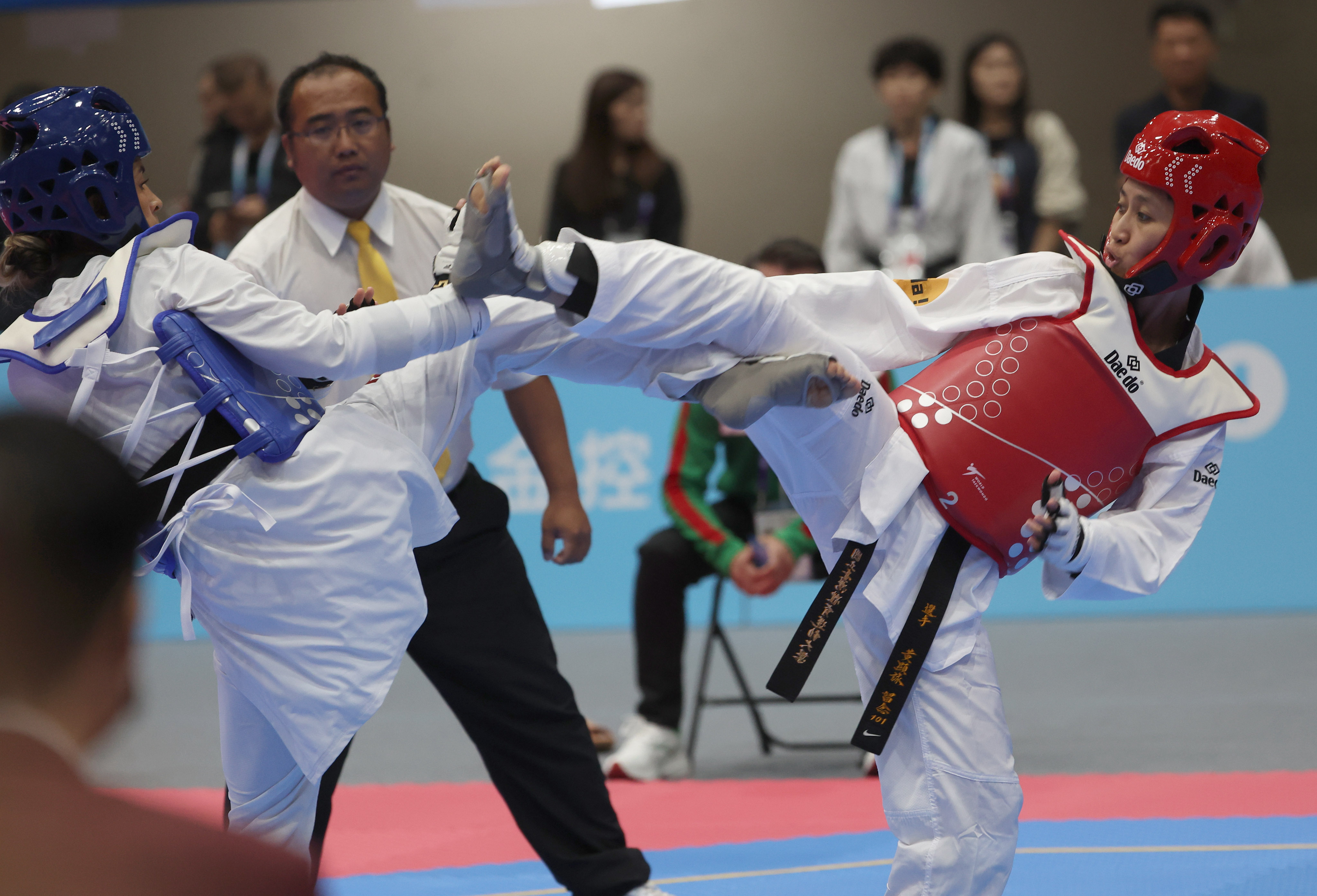 此外,今天場上還有在2010年廣州亞運以16歲之齡驚奇奪金的著名國手夏顯詠(原名黃顯詠),她上一場正式比賽是104年全大運,當時她走出心理陰霾,順利奪金。今天也在世壯運跆拳道個人對打競賽49kg獲得金牌,她說,「回來比賽滿興奮的,在等待的時候還會緊張,原本以為只是來跟學長姐們同樂的,但身為選手,上了場還是會想表現好。」