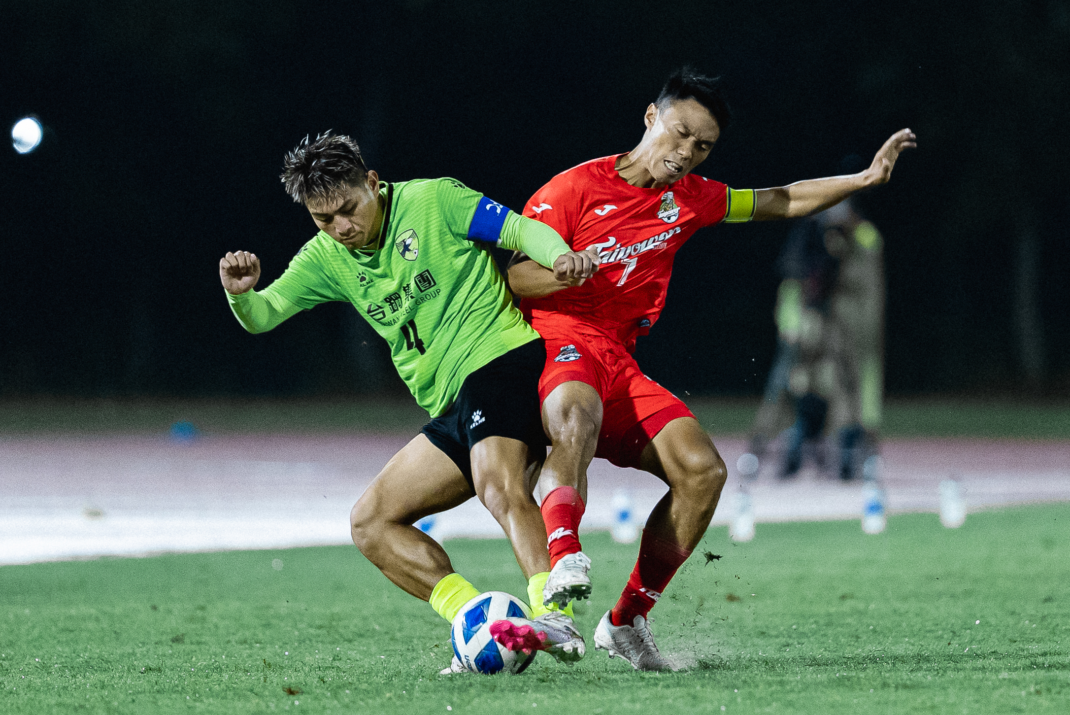 南市台鋼綠馮少祺(左)、台灣電力陳昭安(右)爭奪球權。(中華民國足球協會提供)