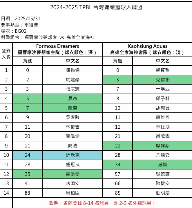 夢想家、海神季後賽G2登錄名單。(TPBL提供)