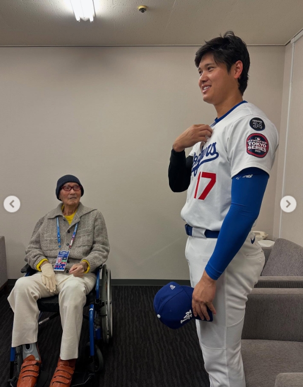 今年3月15日道奇隊在東京巨蛋與讀賣巨人交流賽之前,長嶋茂雄到訪東京巨蛋觀看。賽後,大谷翔平在自己的IG分享與長嶋茂雄合照,展現敬意。