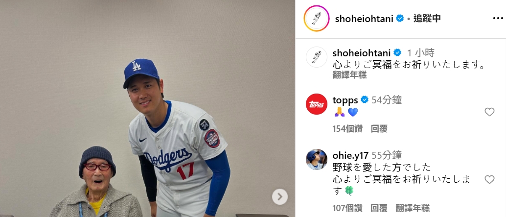 日本職棒傳奇球星、巨人隊終身名譽監督長嶋茂雄今天上午過世,洛杉磯道奇隊日籍球星大谷翔平在IG發上他與長嶋茂雄的3張合照致上哀悼之意。