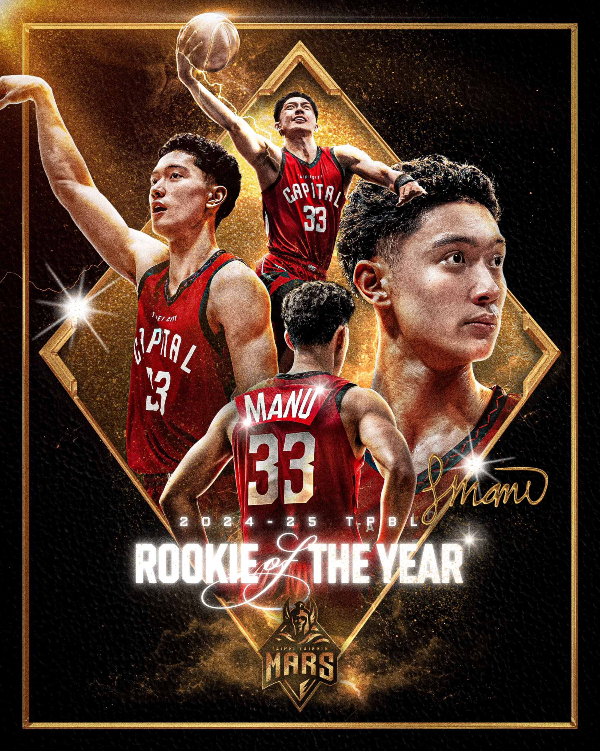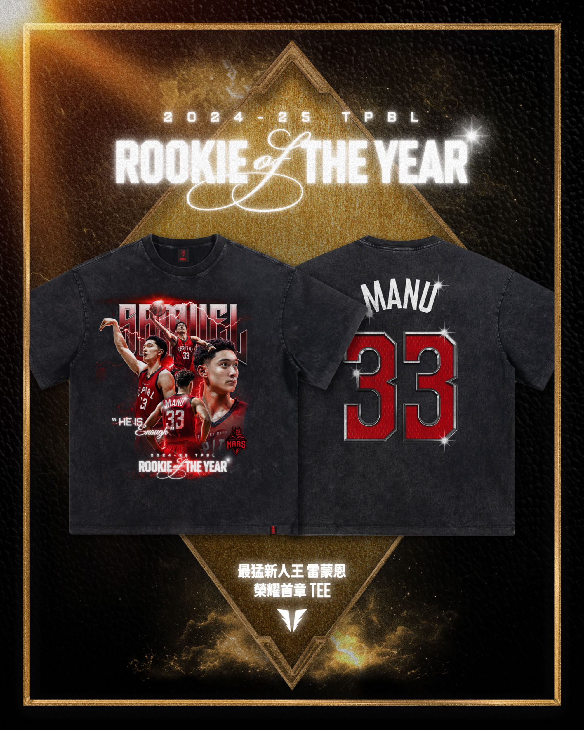 為慶賀新人王的紀念時刻,臺北戰神同步推出【最猛新人王雷蒙恩榮耀首章TEE】,設計靈感源自雷蒙恩的球風與信念。中央主視覺結合他場上各式動態照片,展現他多變、全能的球風,也象徵新秀時期「肯學肯努力嘗試」的態度。