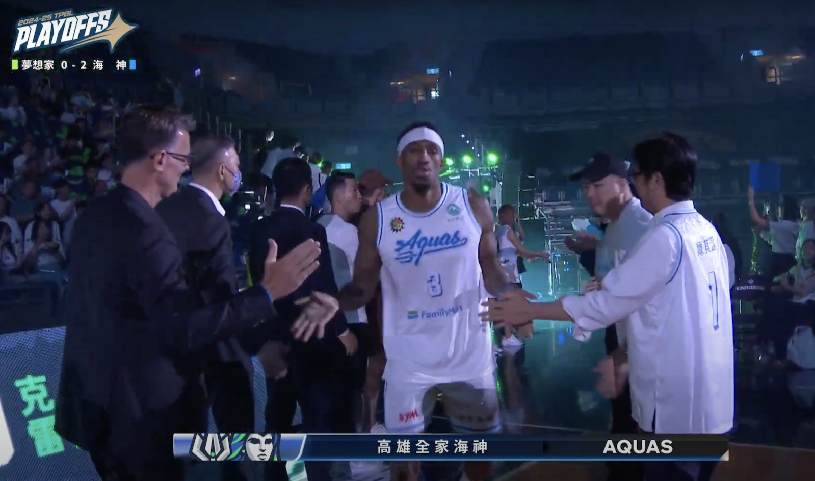 高雄全家海神和福爾摩沙夢想家今天進行季後賽第三戰,場地移師到高雄巨蛋,高雄市長陳其邁也到場,並在海神球員入場時跟球員擊掌打氣。(翻攝TPBL YT)