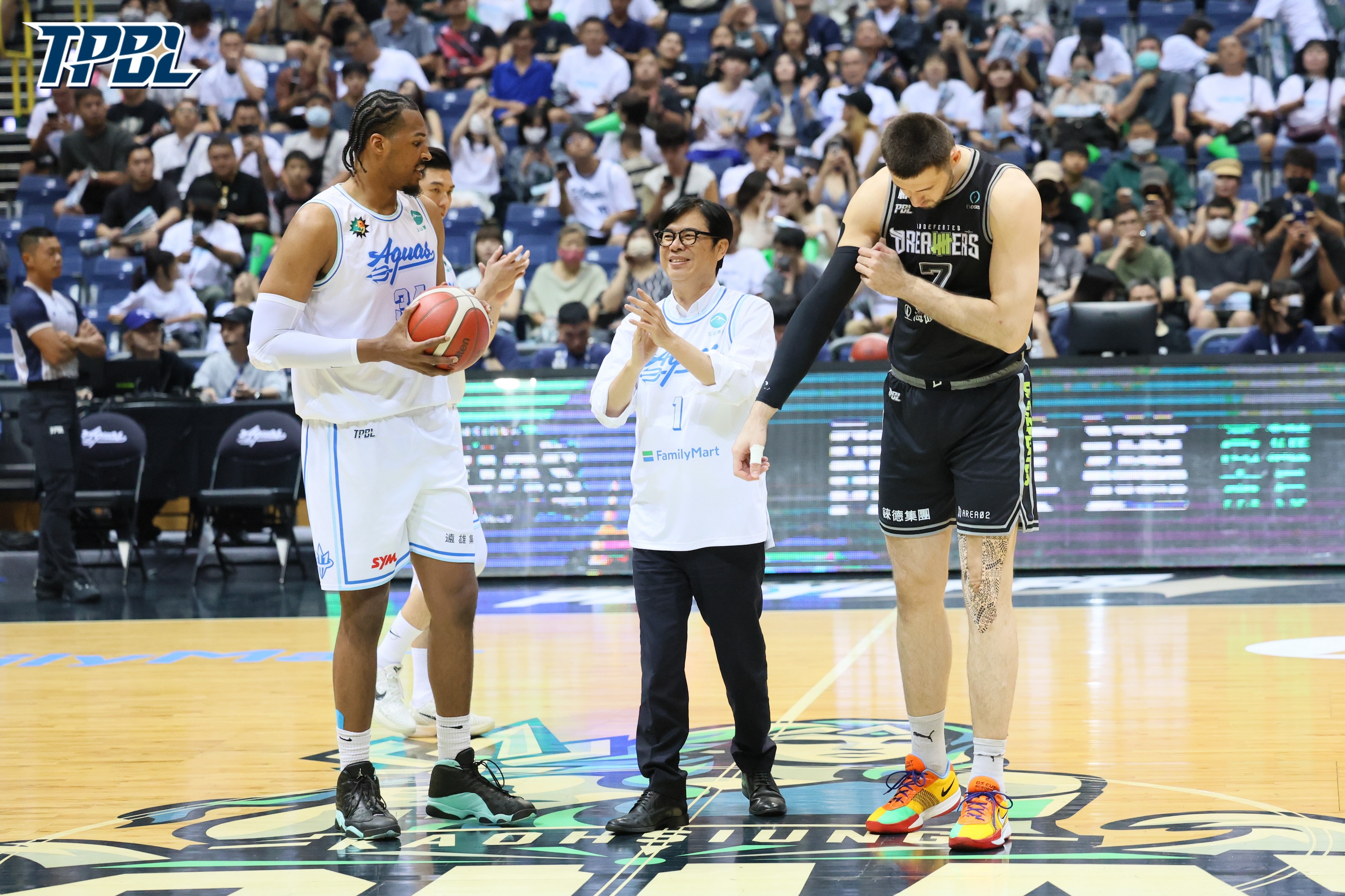 高雄全家海神和福爾摩沙夢想家今天進行季後賽第三戰,場地移師到高雄巨蛋,高雄市長陳其邁也到場,並在海神球員入場時跟球員擊掌打氣,也跟大家圍在一起集氣,接著跟兩隊拍大合照,再為比賽開球。