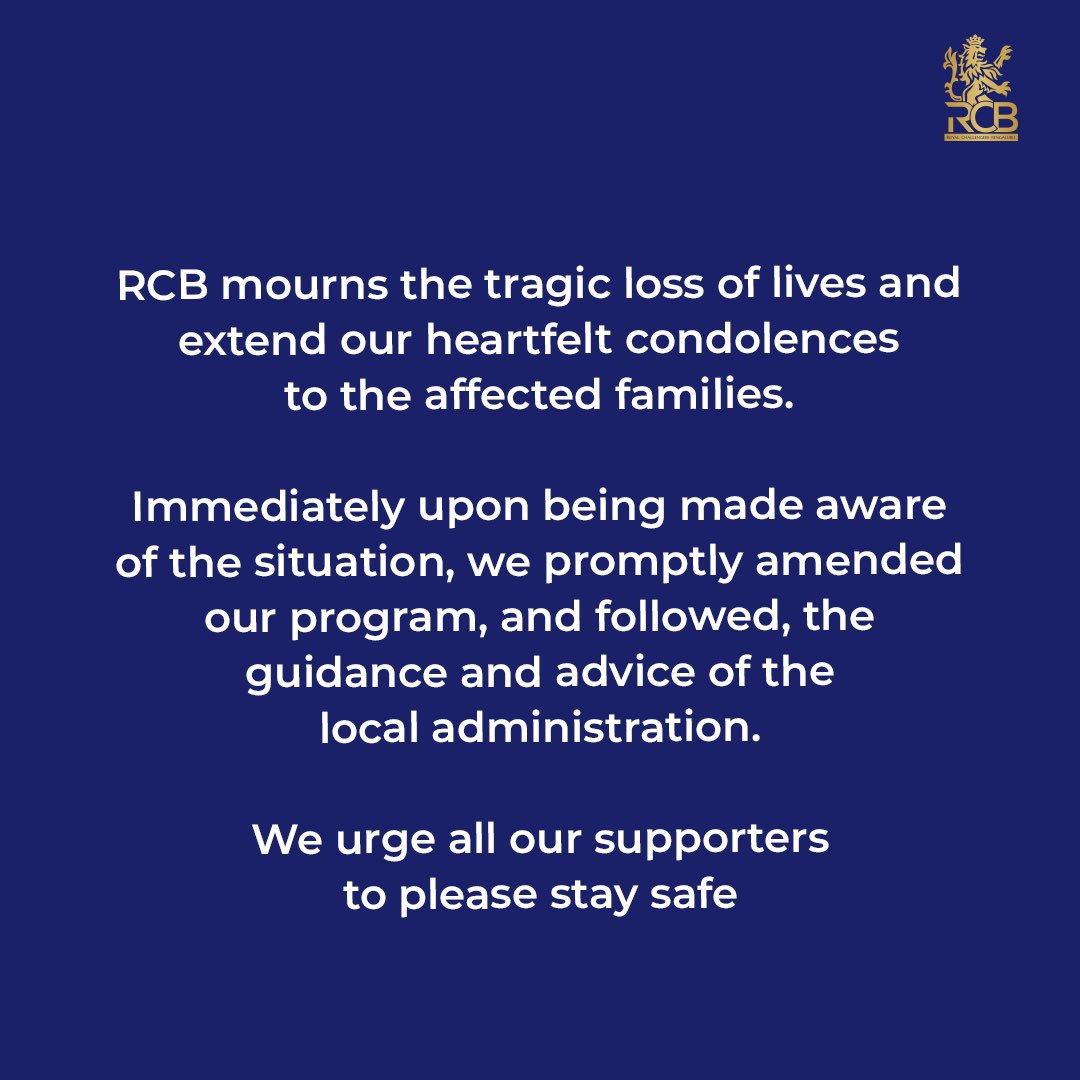 皇家挑戰者班加羅爾隊則在社群上聲明,「我們對今天下午班加羅爾各地因迎接球隊而舉行的群眾聚集活動中,媒體報導所揭露的不幸事件感到極度悲痛。對我們而言,大眾的安全與福祉始終是最重要的。」