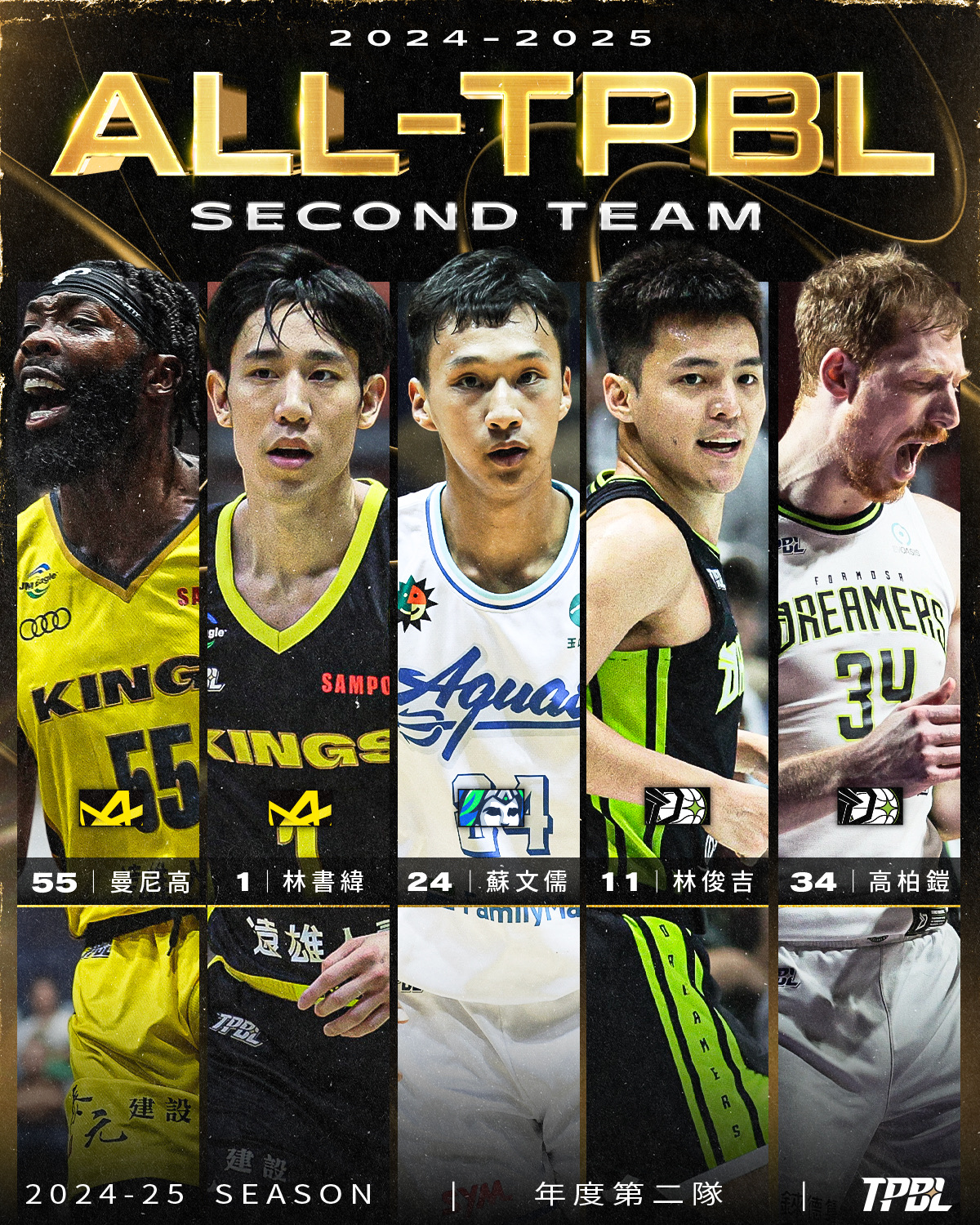 年度第一隊由「禁區王者」沃許本、「得分機器」克羅馬與「全能側翼」馬建豪鎮守前場,另外兩位則由穩坐後場領袖寶座、以經驗與節奏掌控力引領國王前進的林書豪與雲豹攻守節奏引擎、展現超齡成熟與精準決策的高錦瑋聯手擔綱。