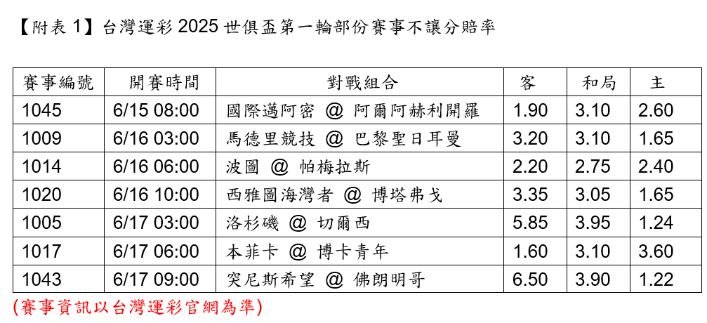台灣運彩已開售冠軍及特別項目玩法,皇家馬德里賠率4.10倍為奪冠大熱門,首輪比賽陸續開盤,開幕戰由梅西領軍的美國新銳國際邁阿密對戰埃及名門阿爾阿赫利開羅,台灣運彩提供單場及場中投注,賽前投注不讓分玩法:國際邁阿密1.90倍、阿爾阿赫利開羅2.60倍、和局3.10倍,看好本場國際邁阿密,有機會在在開幕戰中順利開出紅盤、拔得頭籌。