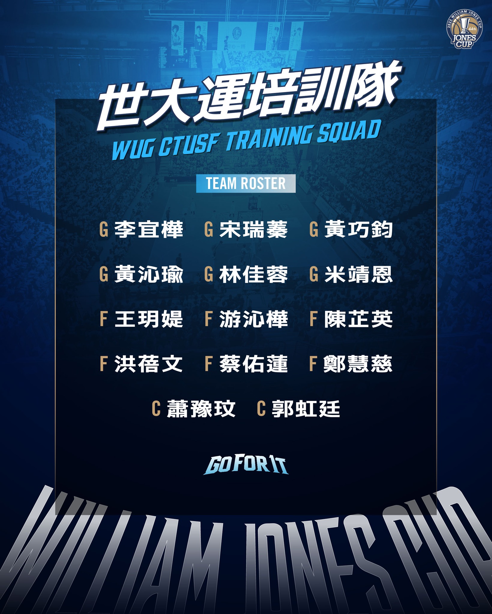 44屆威廉瓊斯國際籃球邀請賽即將到來,女子組賽事將於72日至76日於於臺北和平籃球館登場,籃協稍早公布中華女籃、世大運培訓隊參賽名單,其中中華女籃由彭詩晴5WCBA好手領銜,世大運培訓隊則由WSBL抄截后黃沁瑜擔任隊長,另有NCAA旅美小將米靖恩入列。