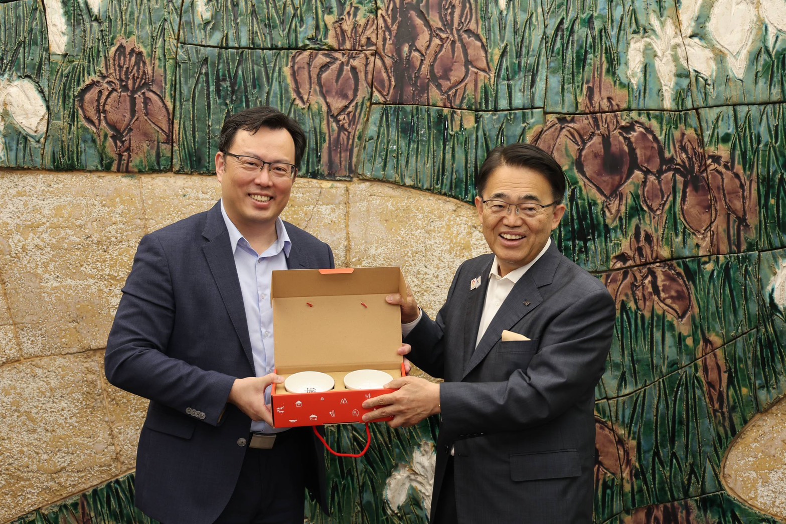 體育署鄭世忠署長(左)一行拜會名古屋市議會西川學議長(右),並互贈紀念品。體育署提供