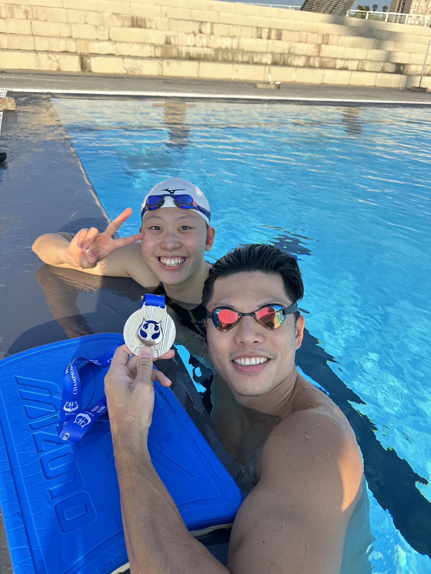 黃渼茜、吳浚鋒在2024年世界蹼泳錦標賽開心合影。(黃渼茜提供)